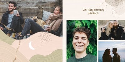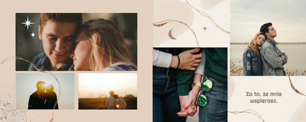 Miłość można wyrażać na wiele sposobów, najprostszym z nich są słowa. Z szablonem "10 powodów za które Cię kocham" wyrazisz swoje uczucia najbliższej Ci osobie. Delikatna kolorystyka podkreśli czułość waszych zdjęć, a złote dodatki dodadzą im elegancji. Stwórz fotoksiążkę złożoną z ulubionych wspomnień ze swoją parą i podkreśl ich wartość czułymi tekstami. Dodawaj więcej stron i powodów, jeśli masz na to ochotę!