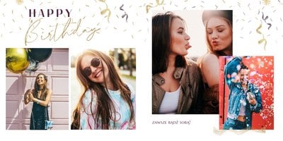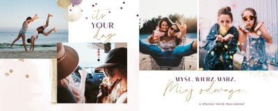 Szablon "18 lat minęło" to propozycja prezentowa pełna odcieni fioletów, złota oraz srebra. Kolory te są motywem przewodnim tego szablonu. Wewnątrz znajdziesz także urodzinowe elementy graficzne, złote napisy, a także nietypowe układy zdjęć.