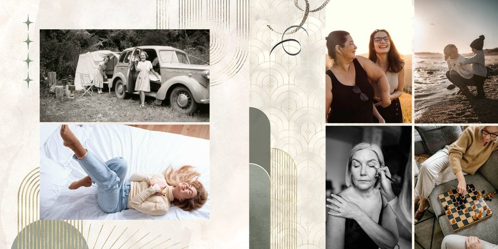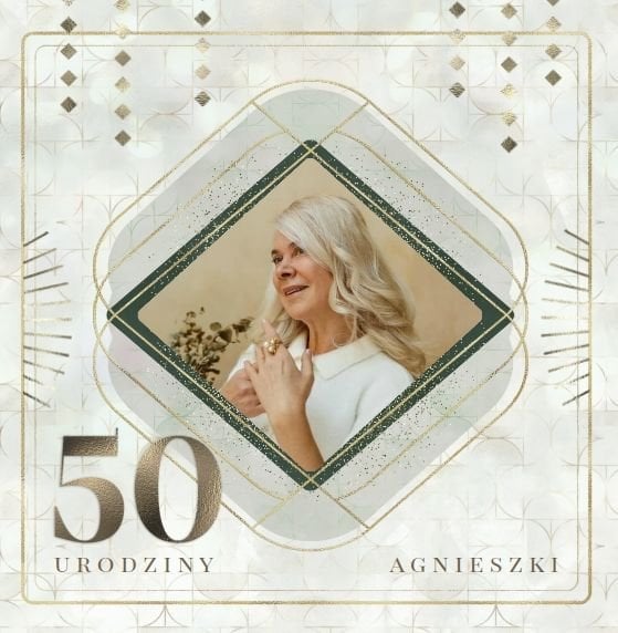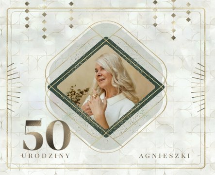 Delikatniejsza, kobieca wersja szablonu "50 urodziny mężczyzny", również nawiązująca swoim stylem do stylu artdeco, jednak tym razem wpisująca się idealnie w kobiece gusta. Obłe kształty (takie jak stylowe łuczki czy koła) oraz jasne, stonowane kolory dodają całości elegancji, podkreślając przy tym każde zdjęcie solenizantki. Metaliczne elementy nawiązują do celebracji i podkreślają urodzinowy charakter fotoalbumu. Układy komórek zdjęciowych świetnie skomponują się z zarówno skanowanymi zdjęciami sprzed lat, jak i nowoczesnymi zdjęciami zrobionymi smartfonem.