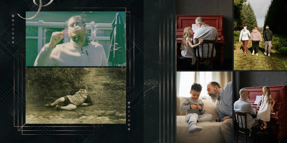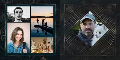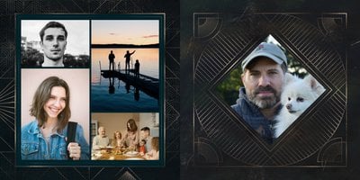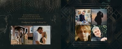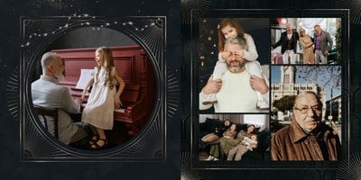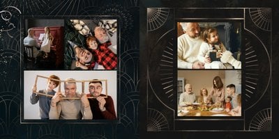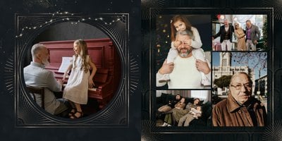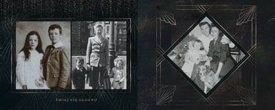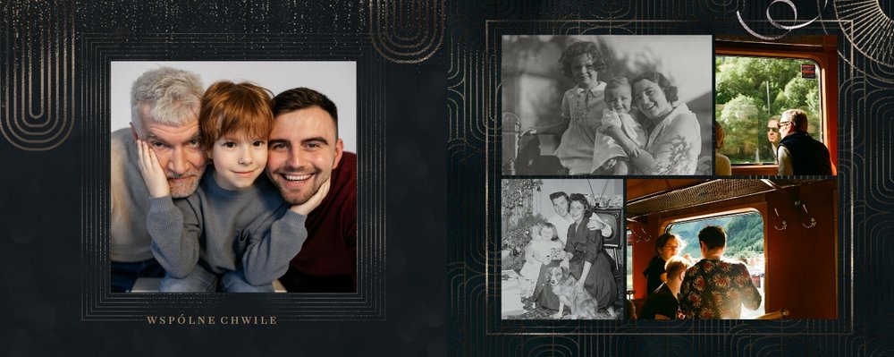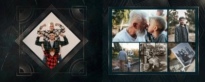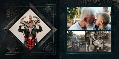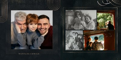 Design szablonu oddaje męski, mocny charakter. Ciemna kolorystyka i elementy, stylizowane na metaliczne, tworzą nieoczywisty, wysokiej jakości styl projektu. Rozkładówki budują unikalną opowieść o obdarowanym. Układy komórek zdjęciowych świetnie zachowają zarówno skanowane zdjęcia sprzed lat, jak i najnowsze fotografie zrobione smartfonem.