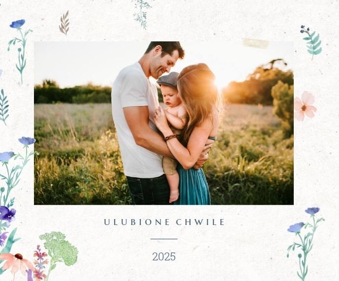 Szablon nawiązuje do motywów polskiej przygody - łąk, otulonych delikatnymi kwiatami w odcieniach błękitu, czerwieni i zieleni. Jednak kolorem przewodnim jest biel, czyli barwa idealnie podkreślająca Twoje zdjęcia i elementy graficzne.