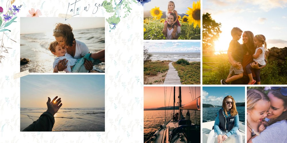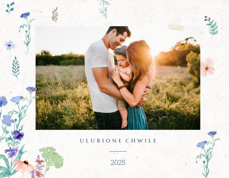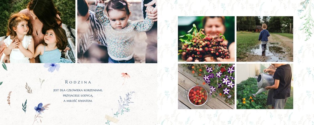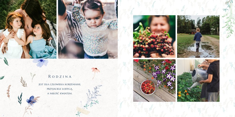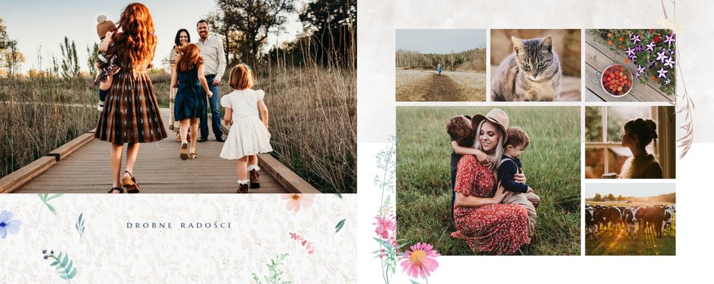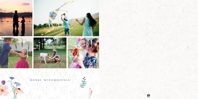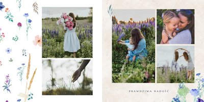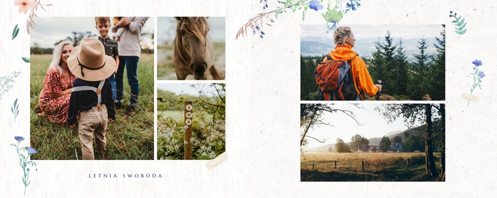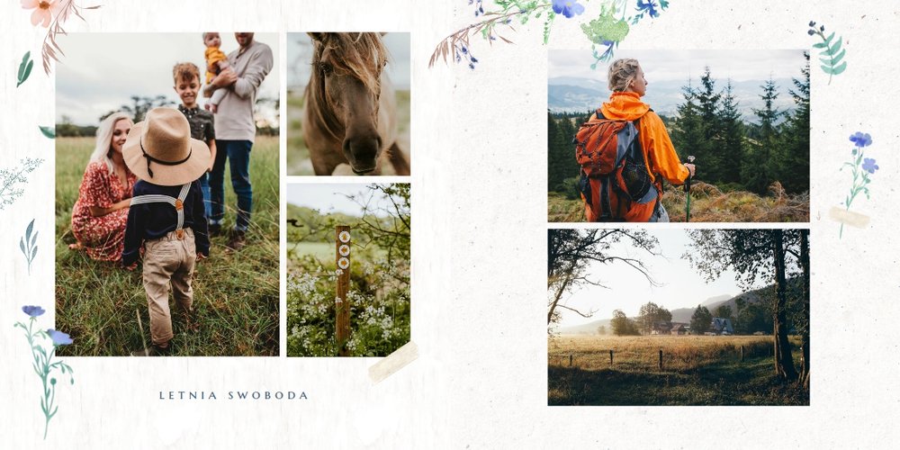 Szablon nawiązuje do motywów polskiej przygody - łąk, otulonych delikatnymi kwiatami w odcieniach błękitu, czerwieni i zieleni. Jednak kolorem przewodnim jest biel, czyli barwa idealnie podkreślająca Twoje zdjęcia i elementy graficzne.