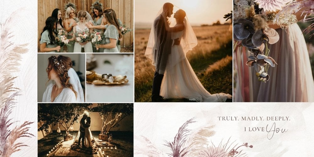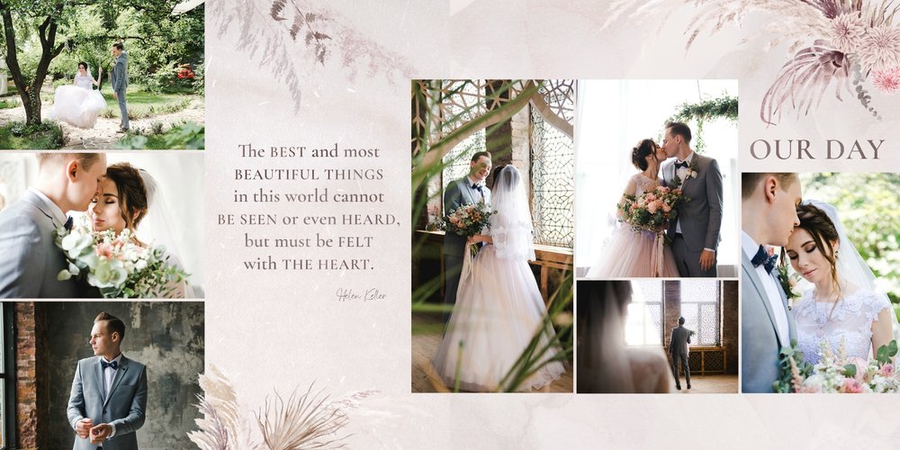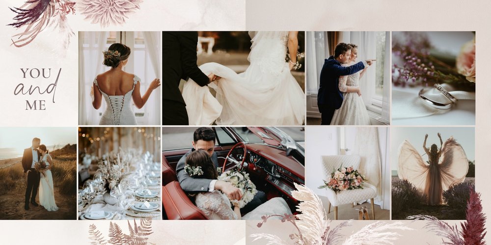 Kolorystyka skupia się wokół beżu, pastelowego różu i lekkiego burgundu - tworząc tym samym stonowany, aczkolwiek nietypowy design. Strony przyozdobione zostały w elementy bliskie naturze, takie jak trawy pampasowe, palmy czy liście strelicji. Wąskie złote łuki subtelnie podkreślają elegancję i wzniosłość uwidocznioną na zdjęciach. Całość dopełniają zapiski sentencji i krótkich romantycznych wyrażeń.
