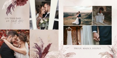 Twoje ślubne fotografie przy akompaniamencie lekkiego wzornictwa w stylu boho utworzą wspaniałe kompozycje na stronach fotoalbumu. Szablon "Boho Wedding" to idealne miejsce dla tych niepowtarzalnych wspomnień, które doświadcza się tylko raz w życiu.