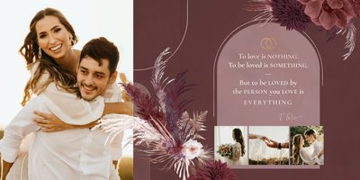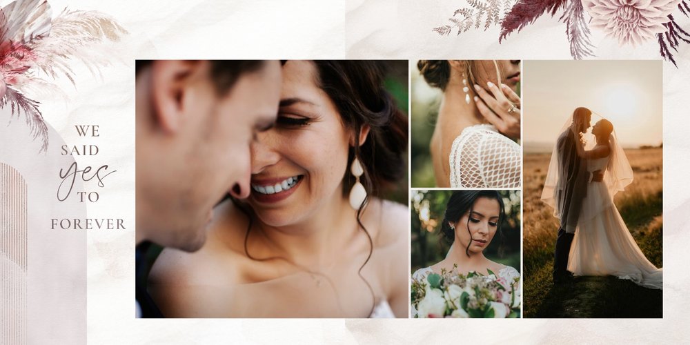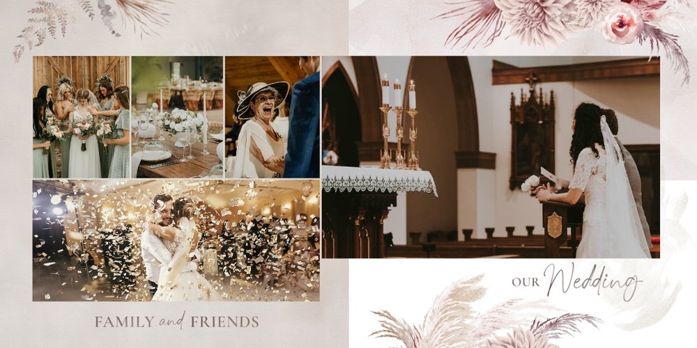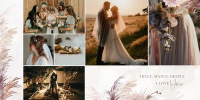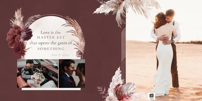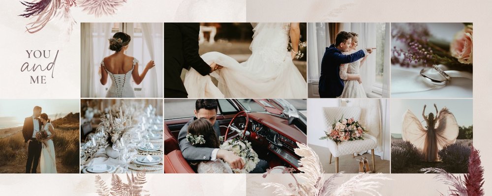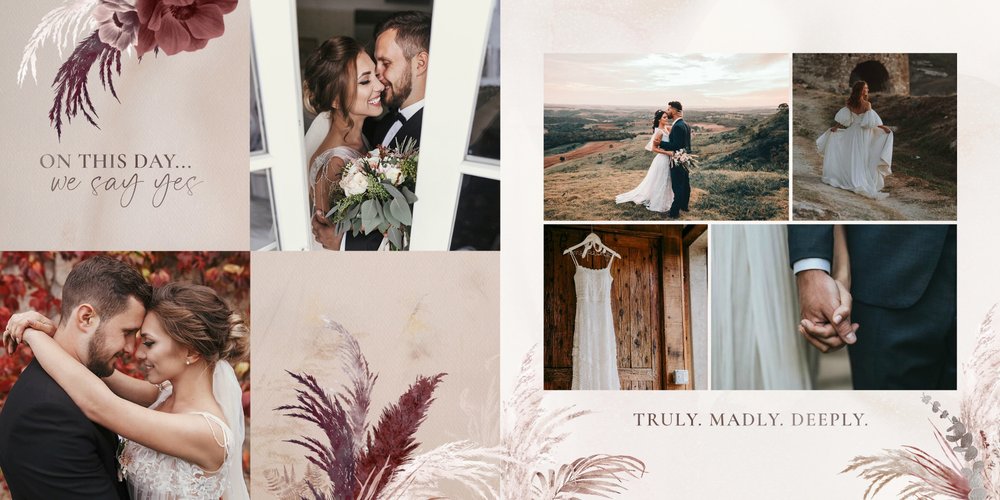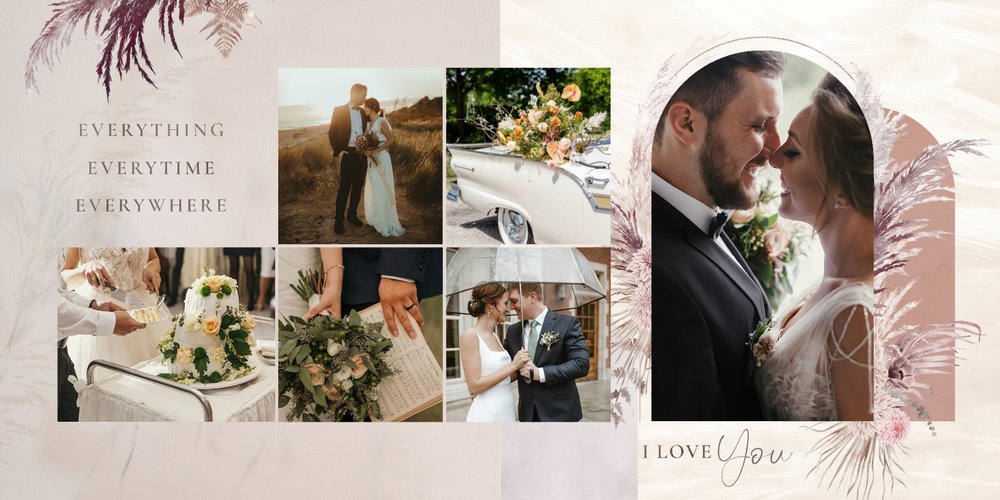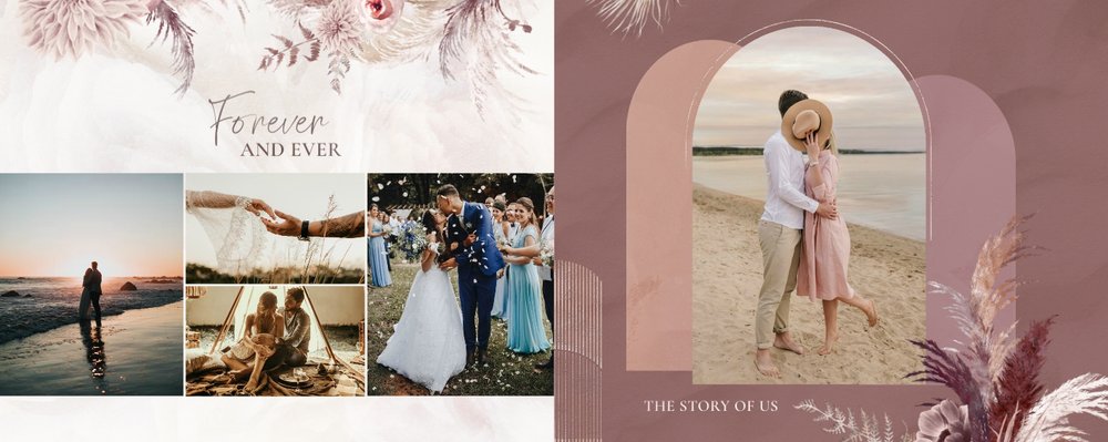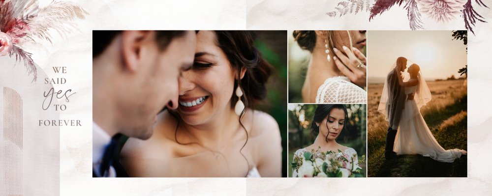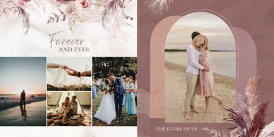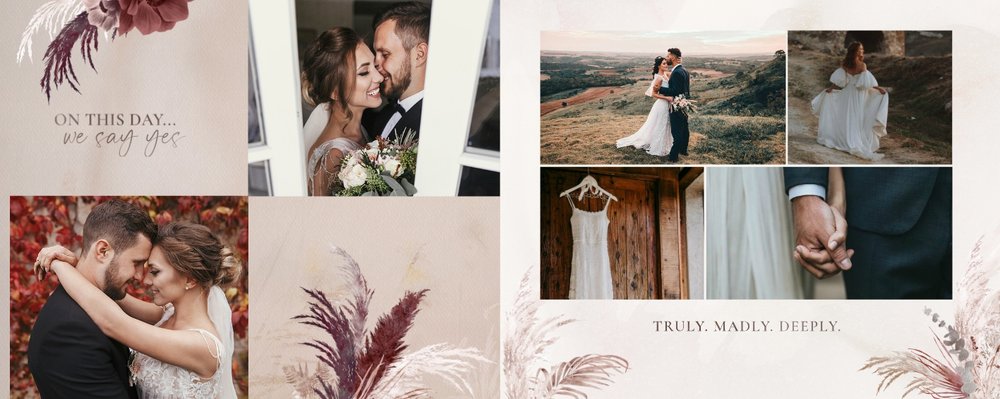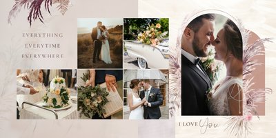 Twoje ślubne fotografie przy akompaniamencie lekkiego wzornictwa w stylu boho utworzą wspaniałe kompozycje na stronach fotoalbumu. Szablon "Boho Wedding" to idealne miejsce dla tych niepowtarzalnych wspomnień, które doświadcza się tylko raz w życiu.