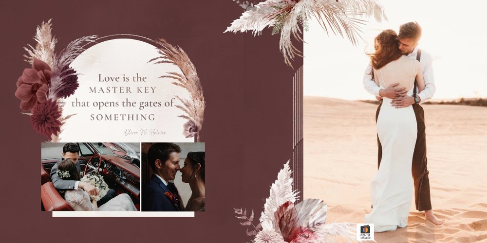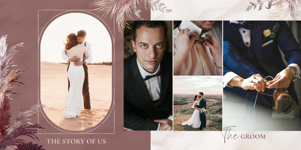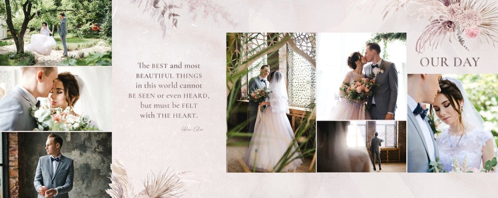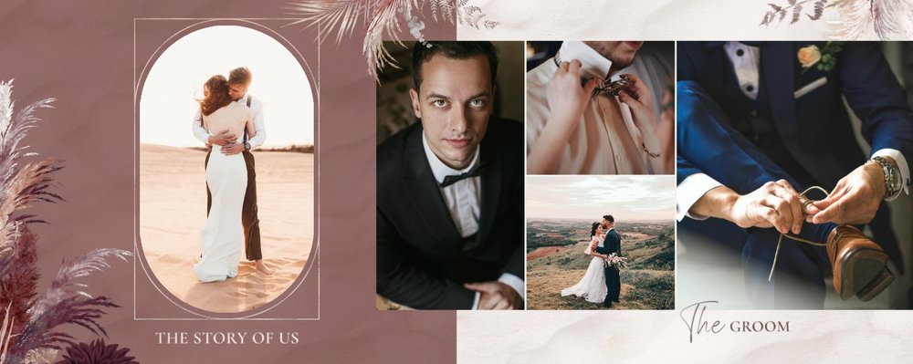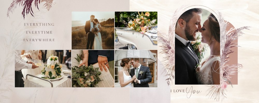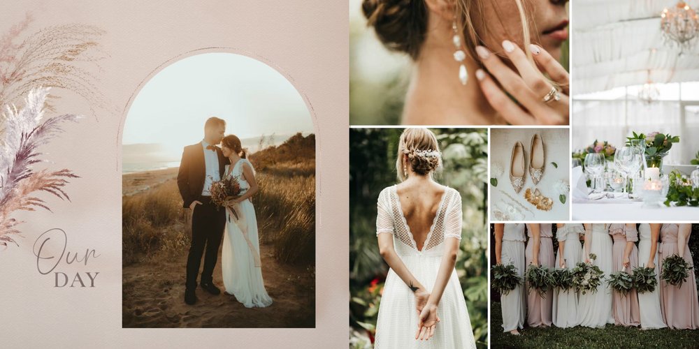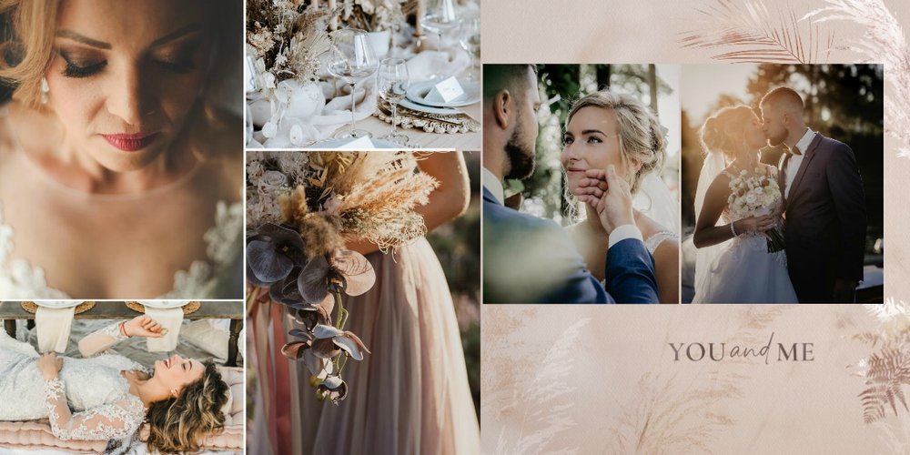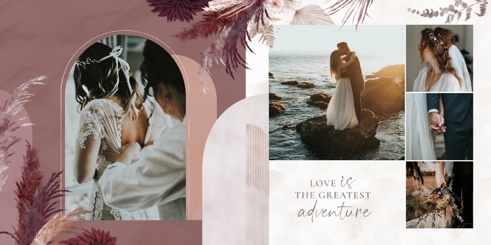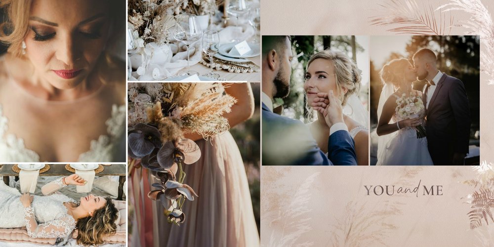 Kolorystyka skupia się wokół beżu, pastelowego różu i lekkiego burgundu - tworząc tym samym stonowany, aczkolwiek nietypowy design. Strony przyozdobione zostały w elementy bliskie naturze, takie jak trawy pampasowe, palmy czy liście strelicji. Wąskie złote łuki subtelnie podkreślają elegancję i wzniosłość uwidocznioną na zdjęciach. Całość dopełniają zapiski sentencji i krótkich romantycznych wyrażeń.