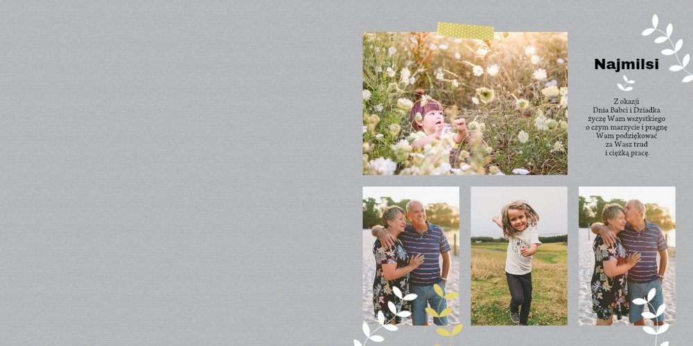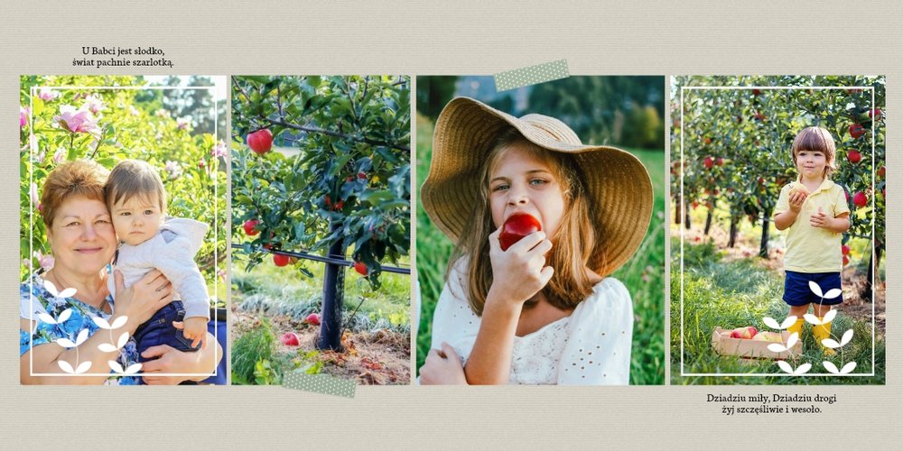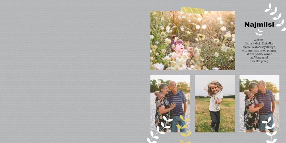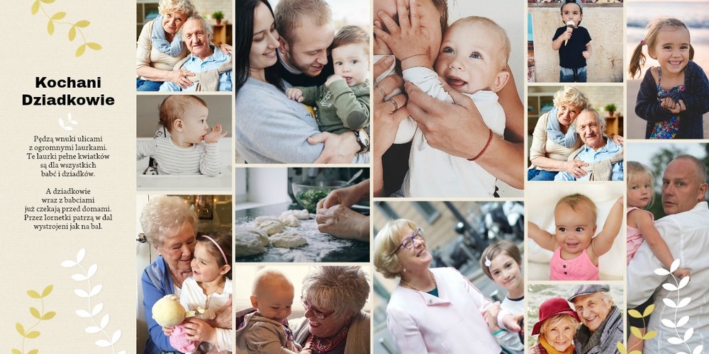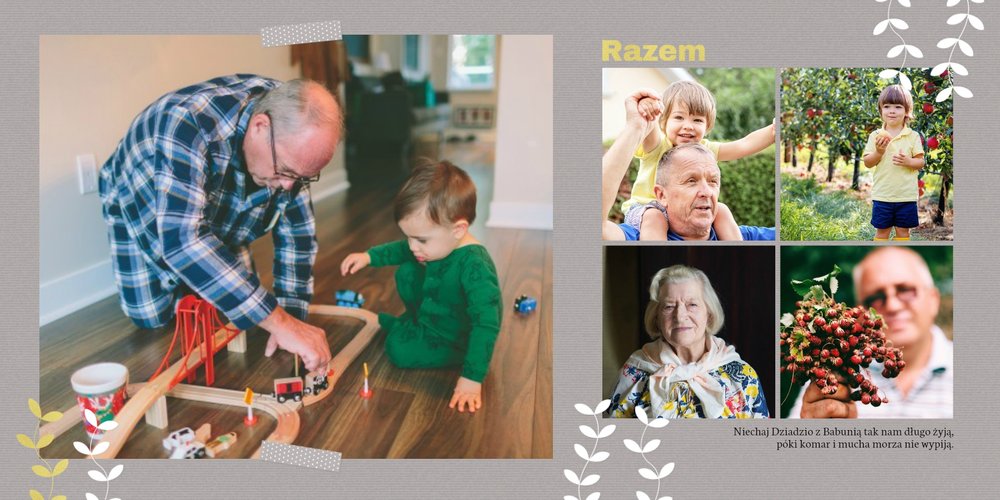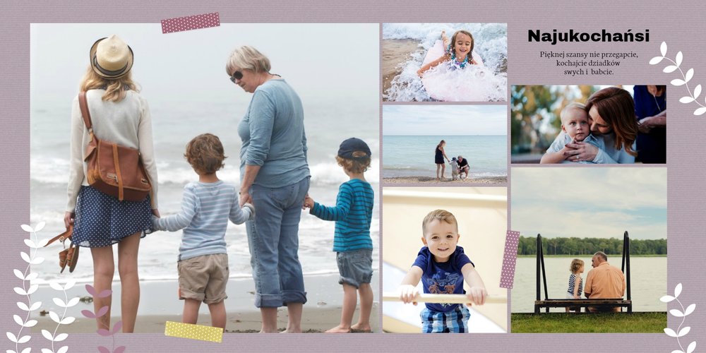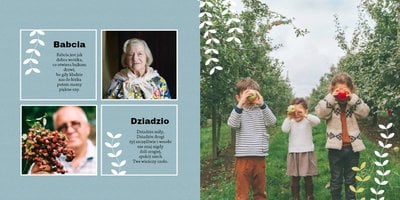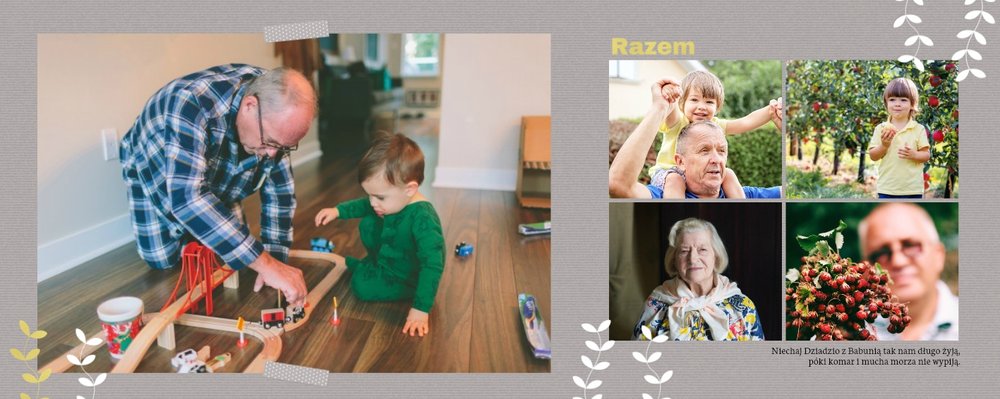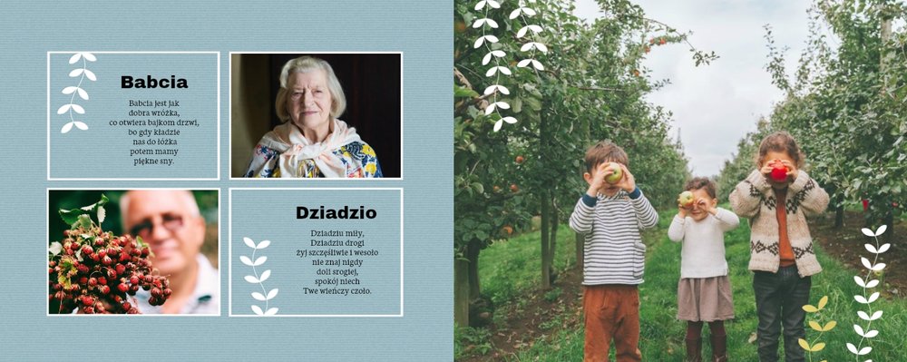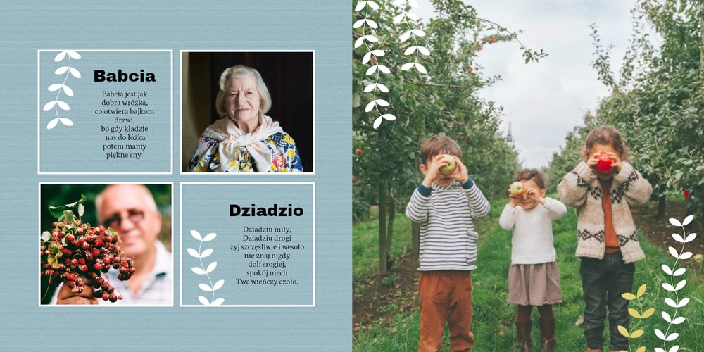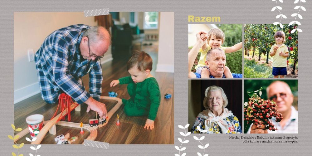 Jak podziekować Dziadkom za opiekę i wsparcie? Fotoalbum z szablonem Dla Dziadków stanie się piękną pamiątką i prezentem z okazji ich święta. Szablon zaprojektowany specjalnie pod tę wyjątkową okazję, to ciepłe kolory, oryginalne wzory oraz układy, które pomieszą wiele rodzinnych zdjęć. Fotoalbum Dla Dziadków dedykujemy wszystkim wnukom, które chcą podarować kochanej Babci i kochanemu Dziadkowi coś wyjątkowego.