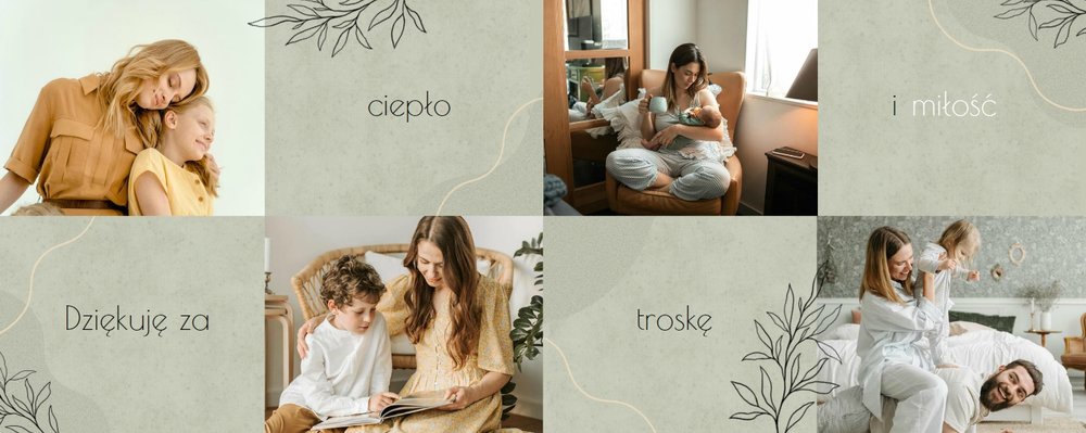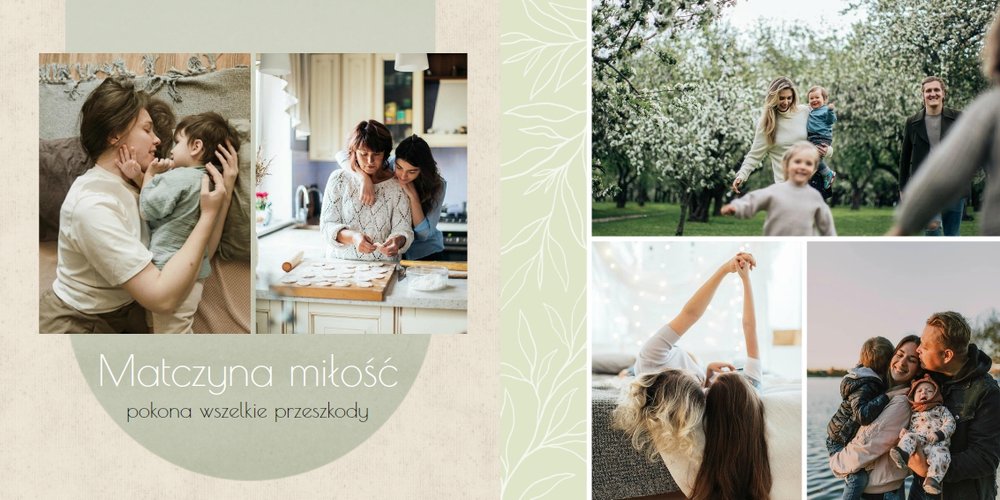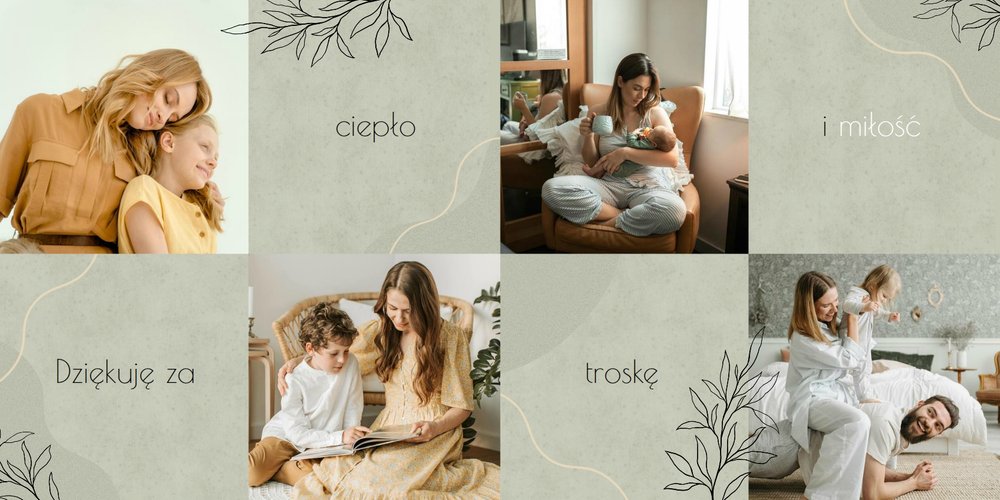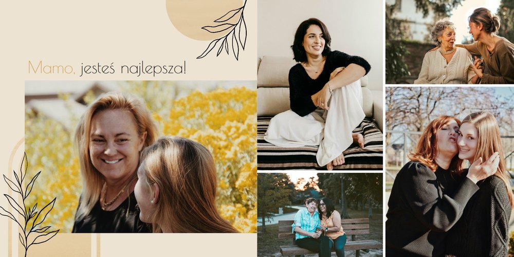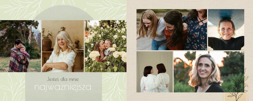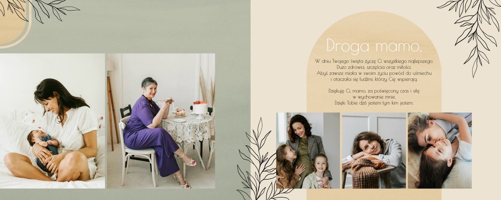 Zaprojektuj fotoalbum wypełniając go rodzinnymi zdjęciami oraz portretami Twojej Mamy. Szablon został zaprojektowany bazując na wiosennych kolorach i wzorach, nawiązujących do majowego święta. Jasna zieleń, musztardowy żółty i beż podkreślą urok zdjęć każdej Mamy, a geometryczne wzory połączone z minimalistycznym stylem boho dodadzą całości unikatowego stylu. Szablon został wypełniony w czułe teksty, które każda Mama powinna usłyszeć - nie tylko na Dzień Mamy.