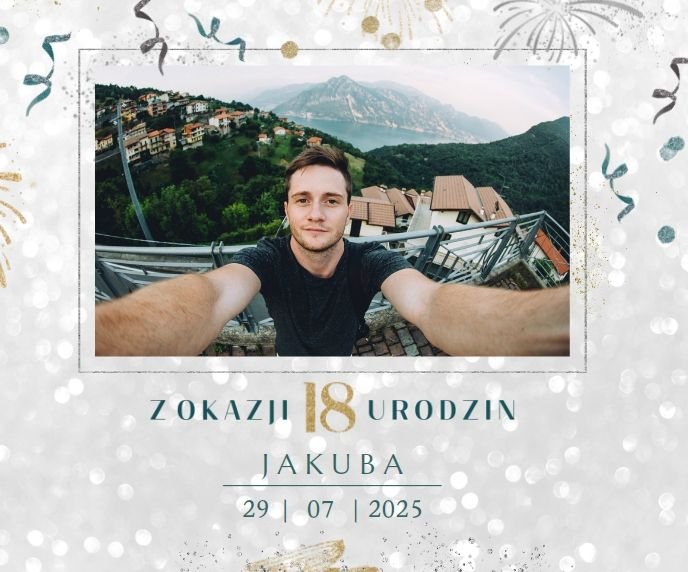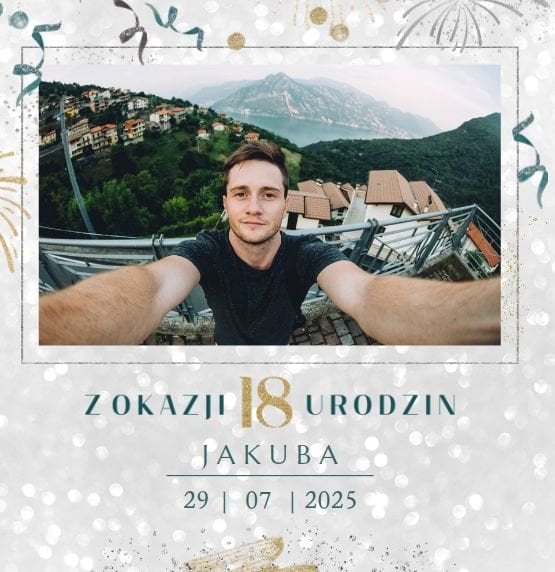 Szablon "Dla osiemnastolatka" to propozycja przepełniona akwarelowym motywem w różnych odcieniach granatu, z elementami złota i srebra. Całość dopełniają urodzinowe grafiki oraz wyjątkowe życzenia.