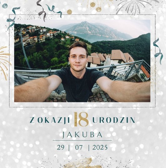 Szablon "Dla osiemnastolatka" to propozycja przepełniona akwarelowym motywem w różnych odcieniach granatu, z elementami złota i srebra. Całość dopełniają urodzinowe grafiki oraz wyjątkowe życzenia.