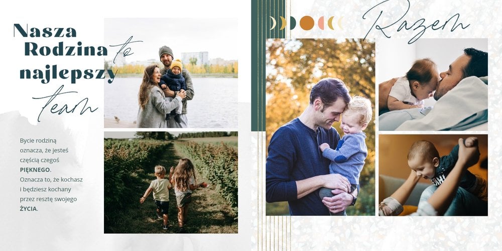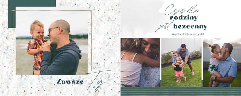 Szablon "Dla Super Taty" to propozycja, w której przeważającym kolorem jest biel, uzupełniona o zielono-niebieskie akcenty i mozaiki - dzięki nim całość nabiera nietypowego charakteru. Oprócz tego szablon zdobią elementy graficzne w kolorze złota. Całość dopełniają czcionki i ciekawe układy komórek na Twoje zdjęcia.
