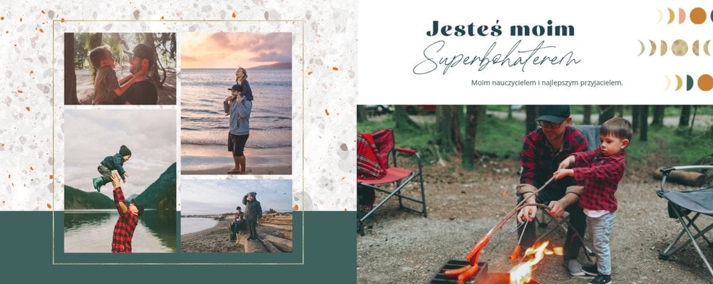 "Dla Super Taty" - szablon, dzięki któremu Twój fotoalbum stanie się wyszukaną i pełną emocji laurką z okazji Dnia Taty. Zamknięte w jego wnętrzu fotografie pozwolą przywołać zapomniane chwile. Ten oryginalny szablon sprawdzi się jako pamiątka i wyraz wdzięczności dla ukochanego Taty, ale także jako prezent dla świeżo upieczonego Ojca. Wyczystko zależy od tego, jakie zdjęcia zamieścisz wewnątrz fotoalbumu.