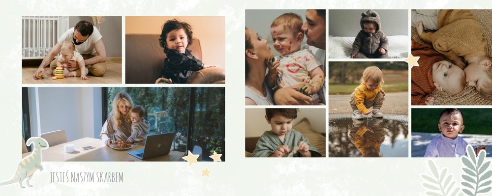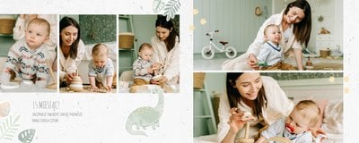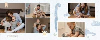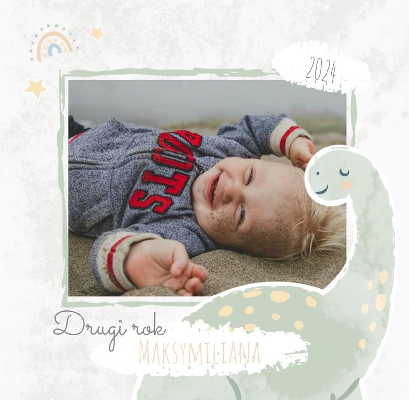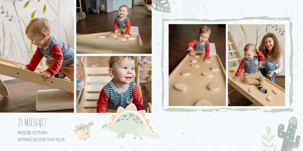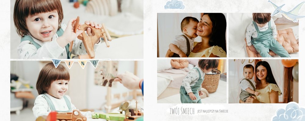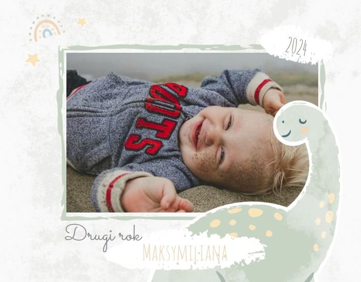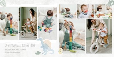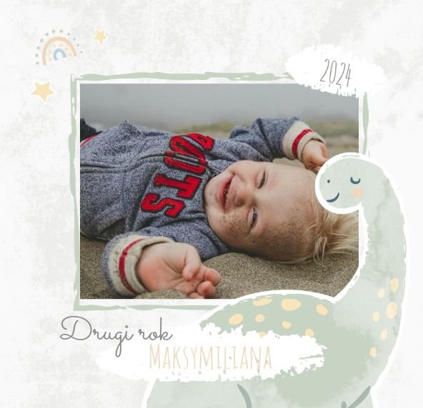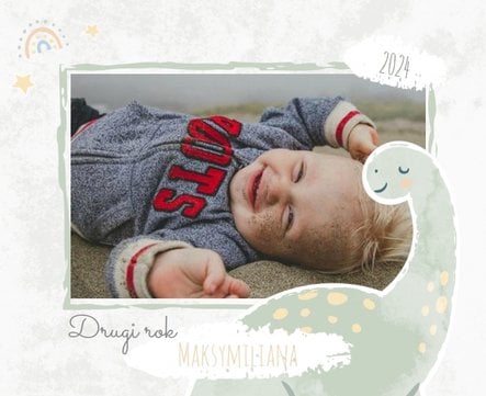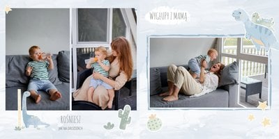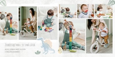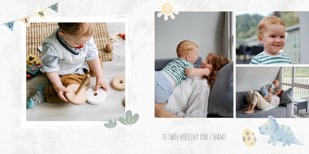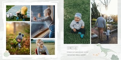 Spraw swojemu dziecku niezapomnianą pamiątkę z jego najpiękniejszych lat. Szablon fotoalbumu "Drugi rok synka" został stworzony z myślą dla wszystkich małych wielbicieli dinozaurów. Kolorowe tła - głównie w odcieniach zieleni i błękitu - podkreślą każde zdjęcie Twojego dziecka, a dinusiowe ilustracje dodadzą uroku i zachęcą do częstego wracania do wspomnień. Z tak przygotowanym fotoalbumem zachowasz najcenniejsze wspomnienia swojego dziecka na lata.