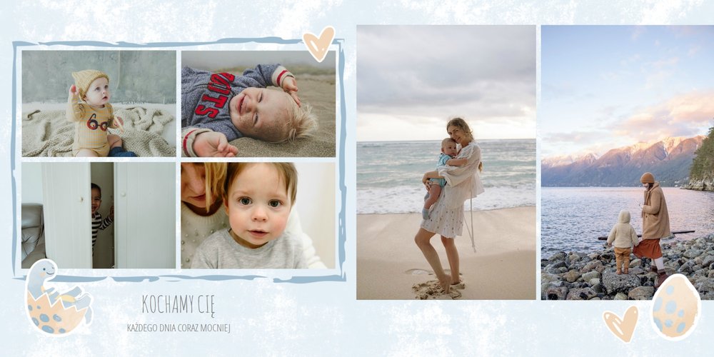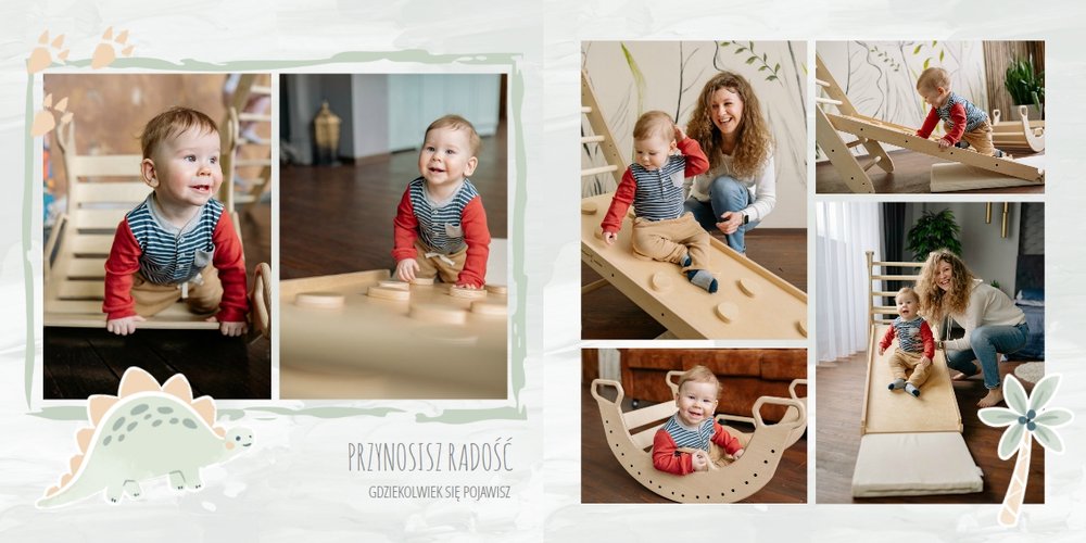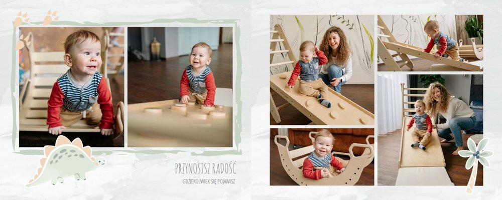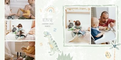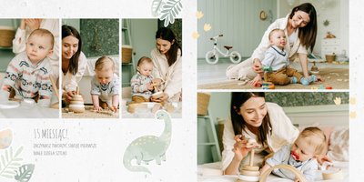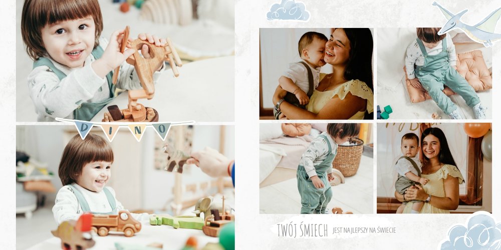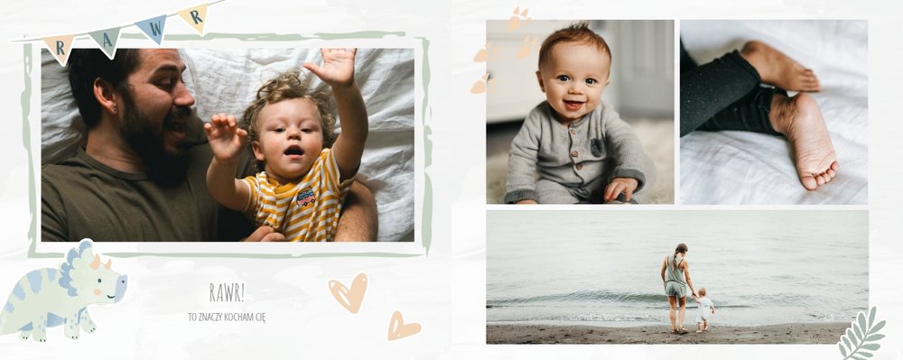 Spraw swojemu dziecku niezapomnianą pamiątkę z jego najpiękniejszych lat. Szablon fotoalbumu "Drugi rok synka" został stworzony z myślą dla wszystkich małych wielbicieli dinozaurów. Kolorowe tła - głównie w odcieniach zieleni i błękitu - podkreślą każde zdjęcie Twojego dziecka, a dinusiowe ilustracje dodadzą uroku i zachęcą do częstego wracania do wspomnień. Z tak przygotowanym fotoalbumem zachowasz najcenniejsze wspomnienia swojego dziecka na lata.