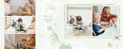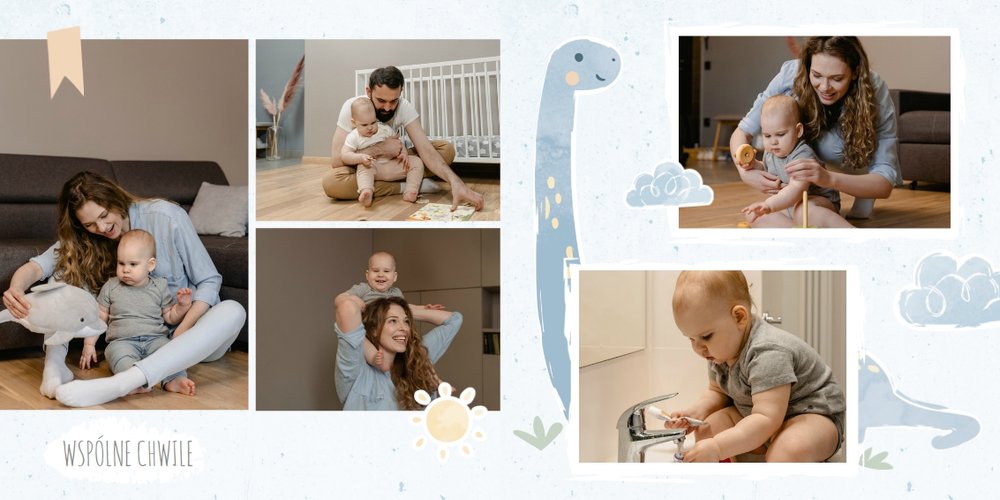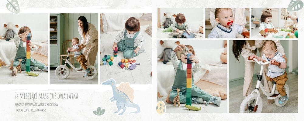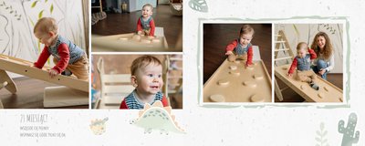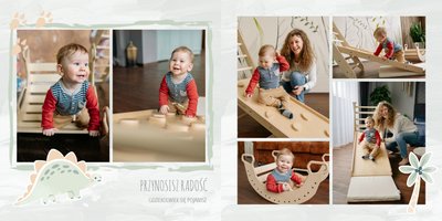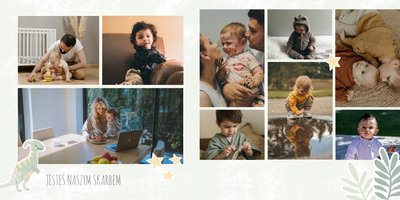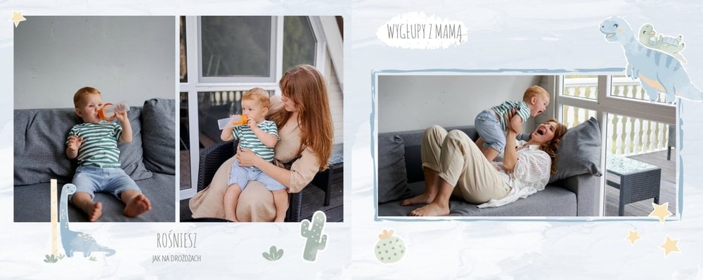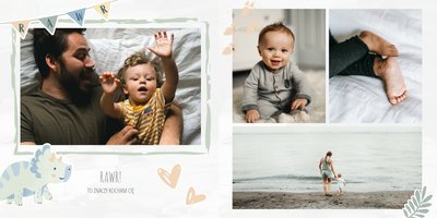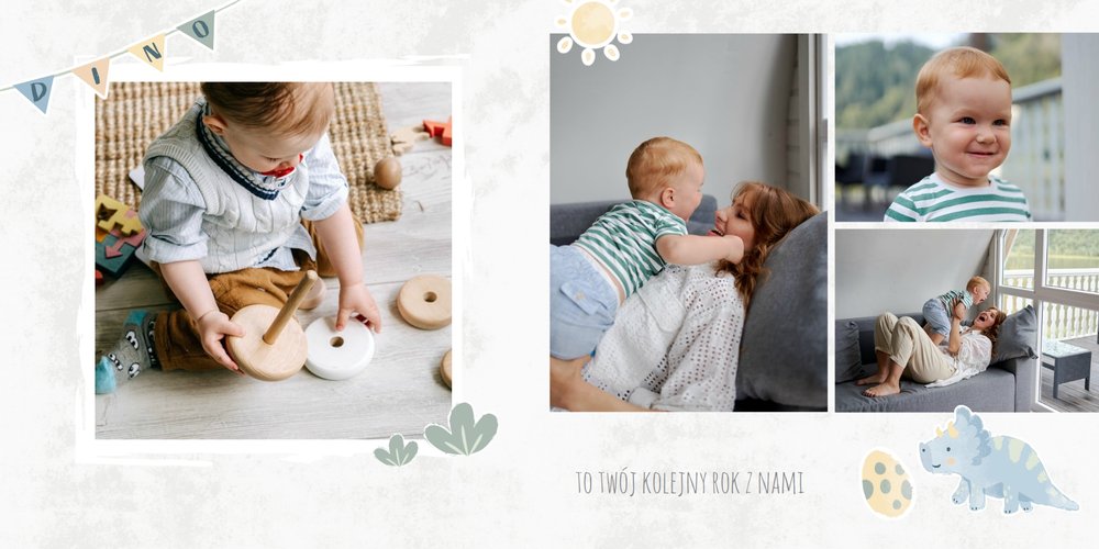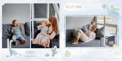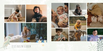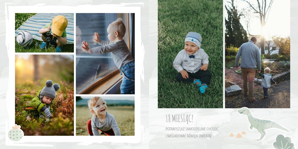 Spraw swojemu dziecku niezapomnianą pamiątkę z jego najpiękniejszych lat. Szablon fotoalbumu "Drugi rok synka" został stworzony z myślą dla wszystkich małych wielbicieli dinozaurów. Kolorowe tła - głównie w odcieniach zieleni i błękitu - podkreślą każde zdjęcie Twojego dziecka, a dinusiowe ilustracje dodadzą uroku i zachęcą do częstego wracania do wspomnień. Z tak przygotowanym fotoalbumem zachowasz najcenniejsze wspomnienia swojego dziecka na lata.