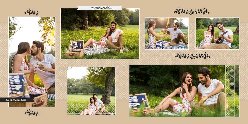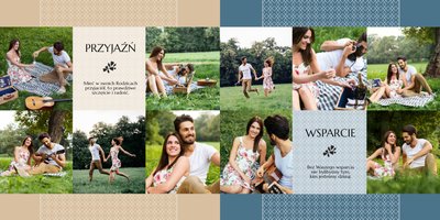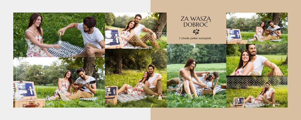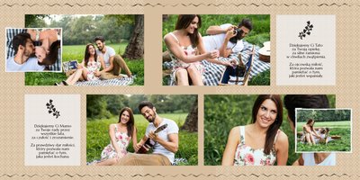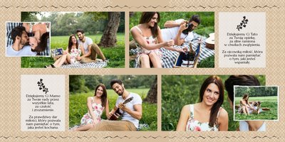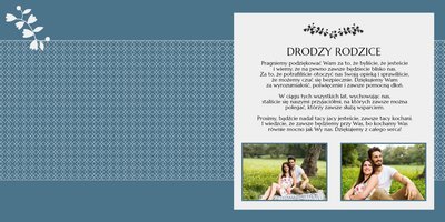 Fotoksiążki ślubne to sposób na oryginalne podziękowania dla rodziców za miłość, wsparcie i wychowanie. Z szablonem “Dziękujemy” Wasze zdjęcia ślubne zyskają efektowną oprawę. Piękne zdobienia, starannie dobrane układy i beżowo-morska kolorystyka z pewnością przypadną do gustu obdarowywanym i będą doskonałym upominkiem ślubnym.