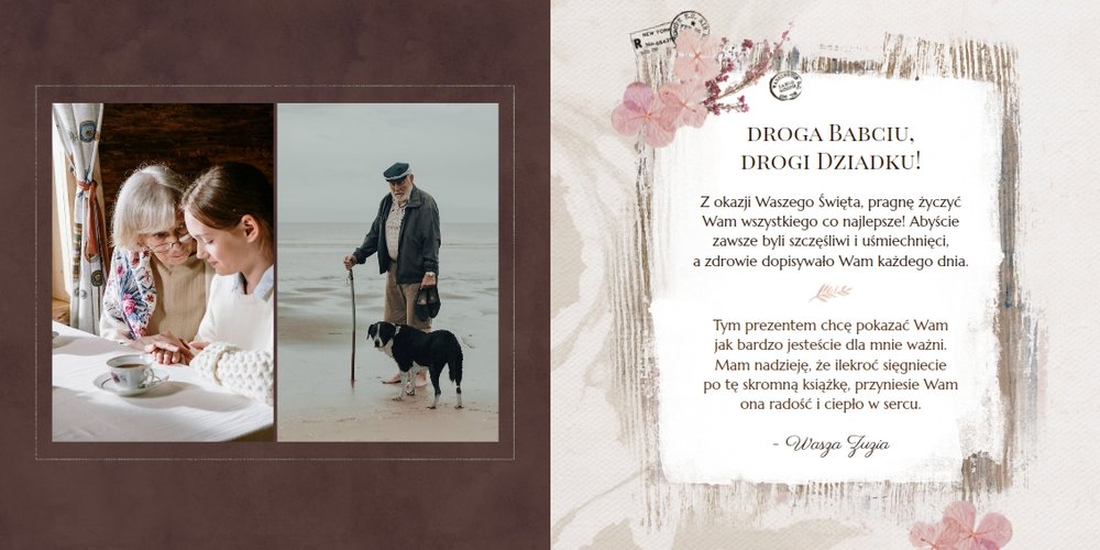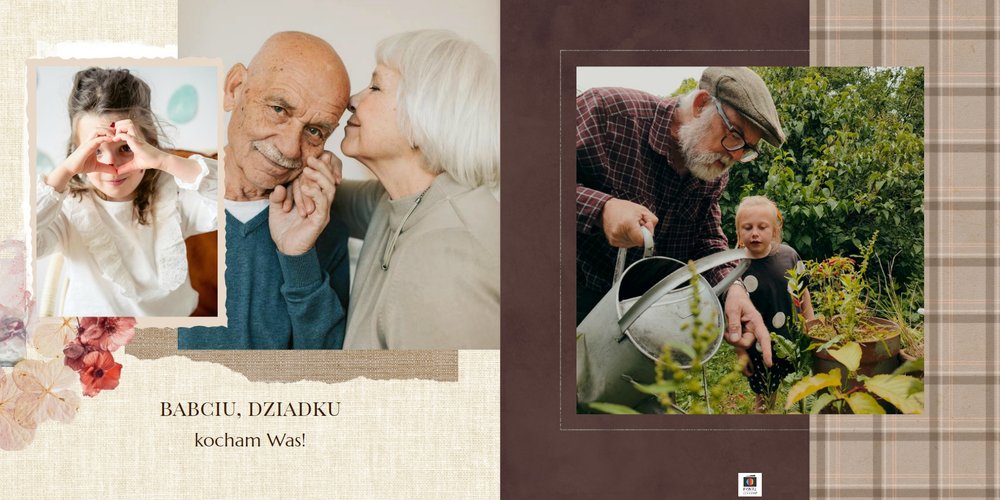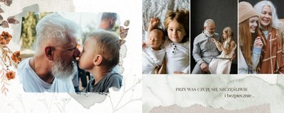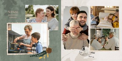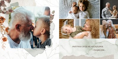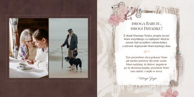 Fotoalbum "Dzień Babci i Dziadka" zaprojektowany został w tradycyjnym, ozdobnym stylu, nawiązującym do naturalnych elementów oraz swojskich klimatów. Elementy graficzne - takie jak kwiaty, stemple, kawałki pergaminu czy woskowe pieczęcie - podkreślą urok każdego zdjęcia z Babcią i Dziadkiem. Specjalnie dobrana paleta kolorów, składająca się z zieleni, brudnego różu, beży i brązów, nada całości wyjątkowy charakter.