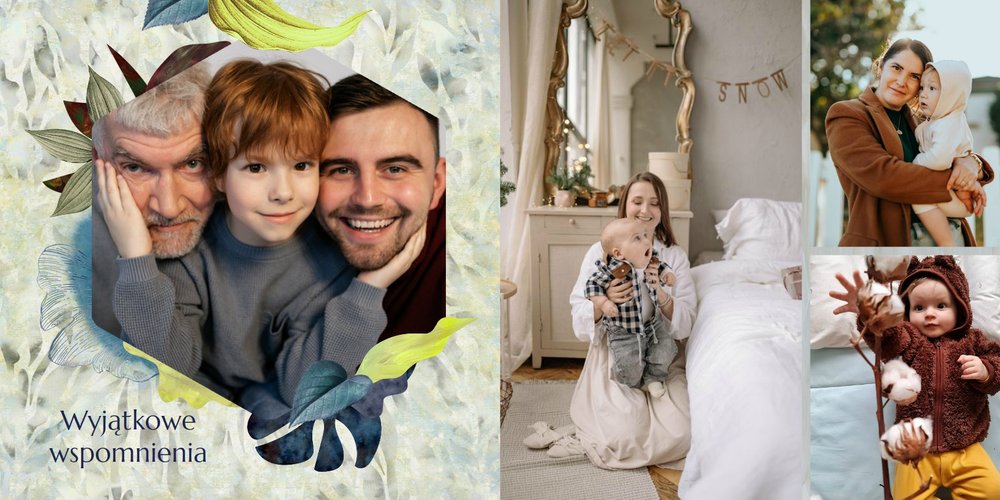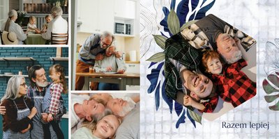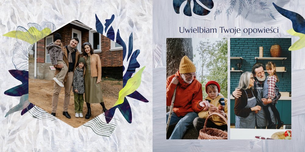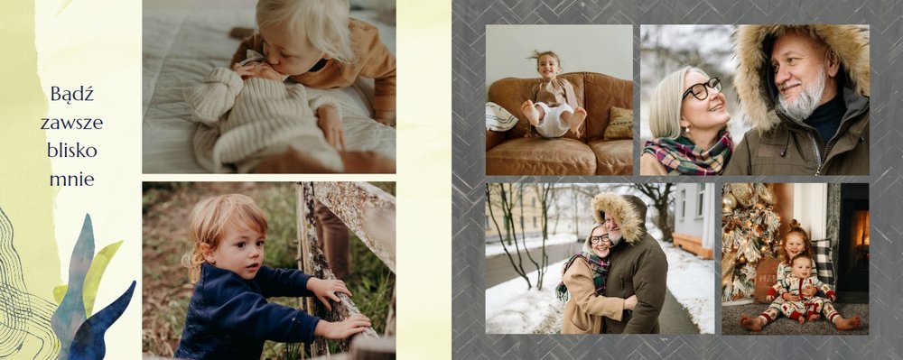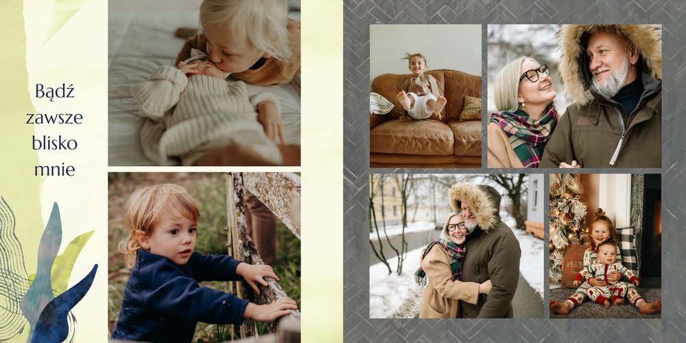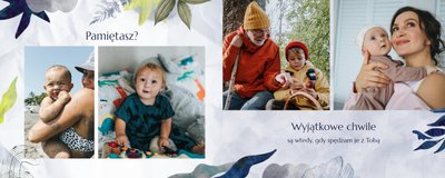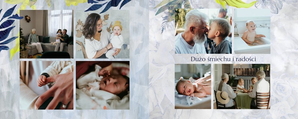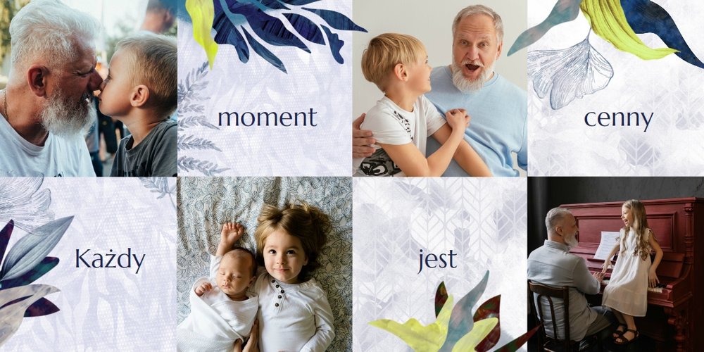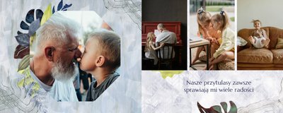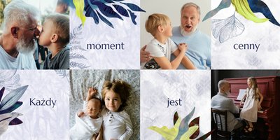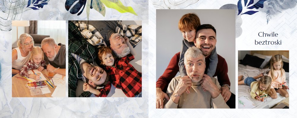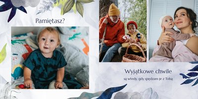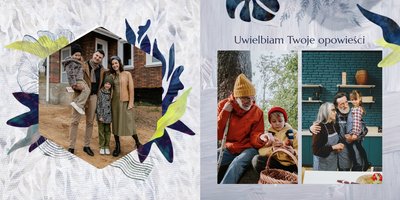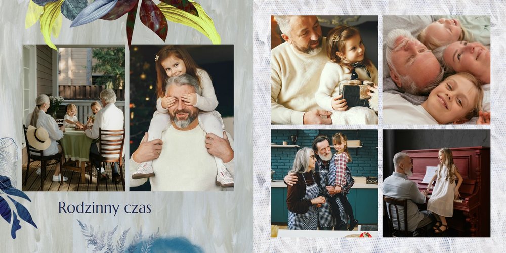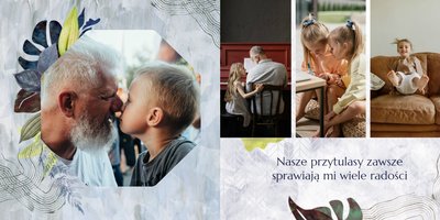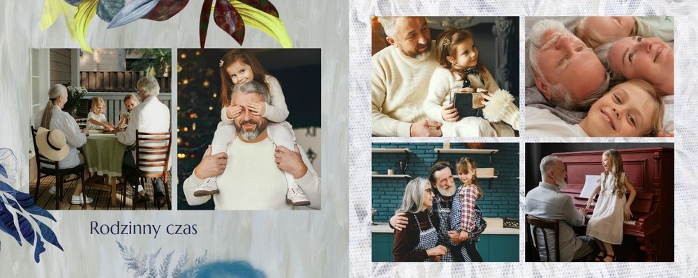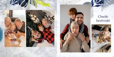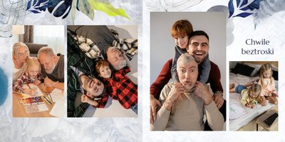 Z szablonem fotoalbumu "Dzień Dziadka" wyczarujesz niezwykły prezent, pełen najbardziej wyjątkowych wspomnień. Nowoczesny design z subtelnymi elementami florystycznymi, zachowany w chłodnej kolorystyce, zachwyci każdego mężczyznę. Skorzystaj z gotowego szablonu i wypełnij rozkładówki uroczymi zdjęciami Twojego malucha lub edytuj wewnętrzne strony fotoalbumu według własnego pomysłu. Możesz dostosować liczbę stron, układ komórek zdjęciowych, elementy ozdobne oraz treść. W imieniu dziecka wręcz swojemu Tacie lub Teściowi najpiękniejszy prezent z okazji ich styczniowego święta.
