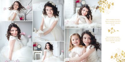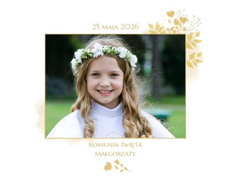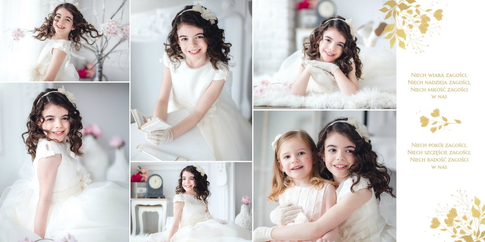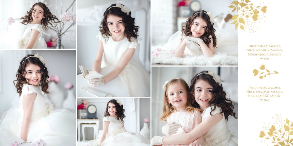 Jeśli pragniesz stworzyć fotoalbum upamiętniający przyjęcie Sakramentu Pierwszej Komunii Świętej to idealnie w tej roli spełni się szablon "Dzień Komunii Świętej". Dzięki niemu zaprojektujesz wyjątkową fotopamiątkę z jednego z najważniejszych dni w życiu Dziecka. Całość szablonu utrzymana jest w bieli z nutą złotych elementów graficznych. Jego minimalistyczna i elegancka forma sprawia, że zdjęcia stają się najważniejsze. Na stronach znajdziesz także komunijne sentencje. Wystarczy, że szablon uzupełnisz o informacje i fotografie.