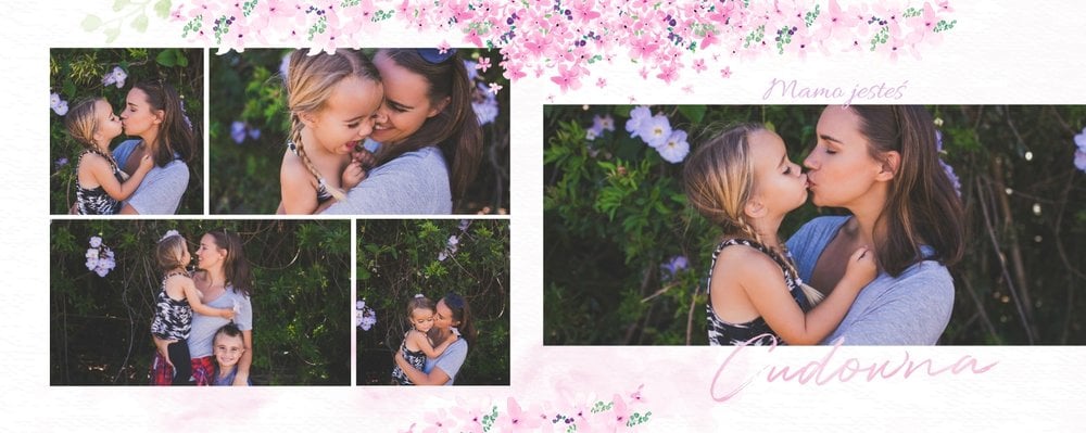 Na Dzień mamy przygotuj idealny prezent! Wybierając szablon Kochanej Mamie stworzysz oryginalną fotoksiążkę wypełnioną, nie tylko wspólnymi zdjęciami, ale także wspomnieniami! Zaprojektowanie tego prezentu zajmie Ci zaledwie kilka minut, a wzruszeniom z przeglądania nie będzie końca. Układ graficzny jest minimalistyczny, a jednocześnie przepełniony kolorem pięknych kwiatów. Szablon jest niezwykle kobiecy, zatem z pewnością spodoba się każdej Mamie. Na stronach możesz zamieścić życzenia, a ramki wypełnić o wspólne fotografie.