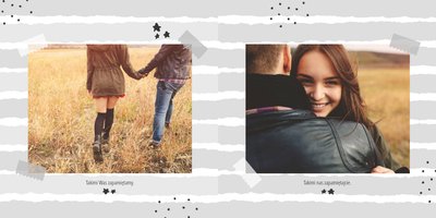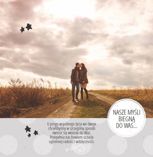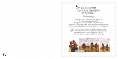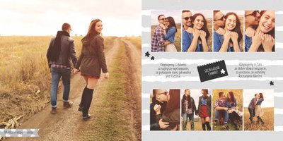 Podziękowanie dla rodziców, to ważny moment na każdym weselu. Wiele par szuka pomysłu na gustowny i niepowtarzalny prezent dla rodziców. Zdjęcia szczęśliwych latorośli będą z pewnością pięknym i ponadczasowym upominkiem. Szablon “Kochanym Rodzicom” idealnie sprawdzi się jako wyraz wdzięczności za miłość i trud wychowania. Książka pozostaje w delikatnych odcieniach bieli i szarości, dodatkowo ozdabiają ją drobne elementy w postaci tasiemek i ramek. Z tym szablonem zaprojektujesz oryginalne podziękowania dla rodziców.