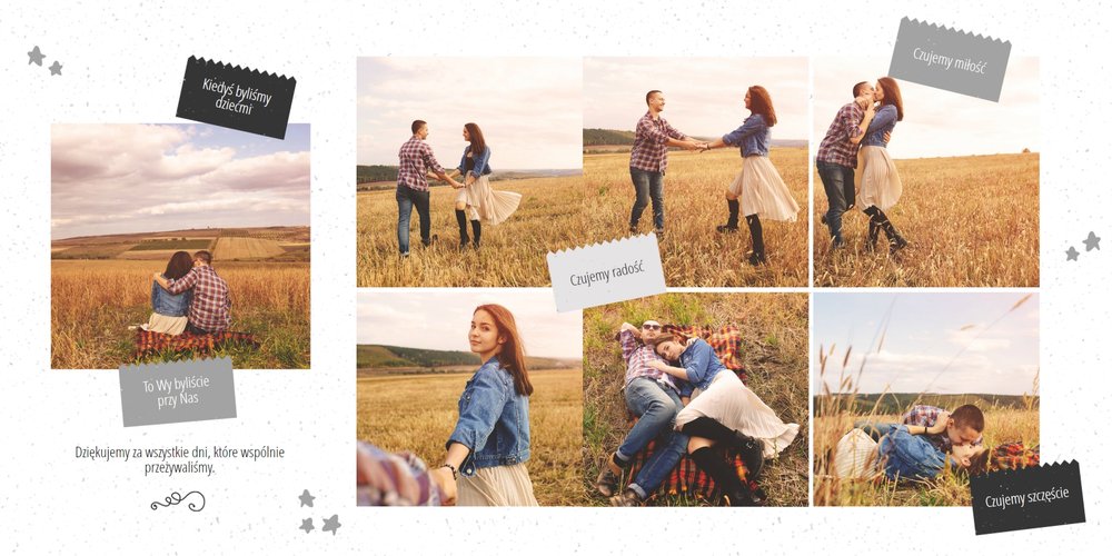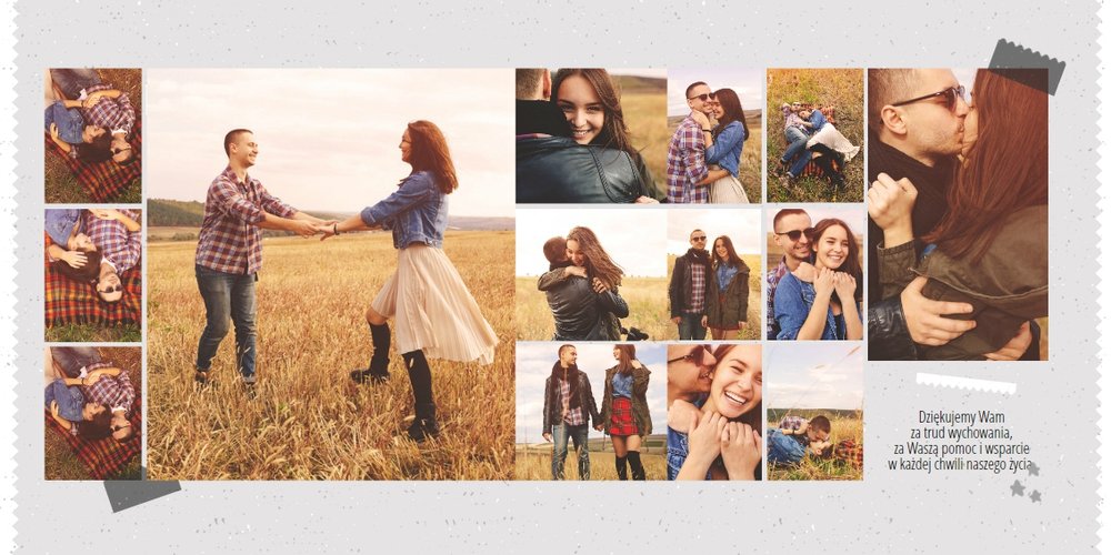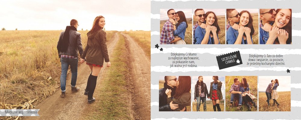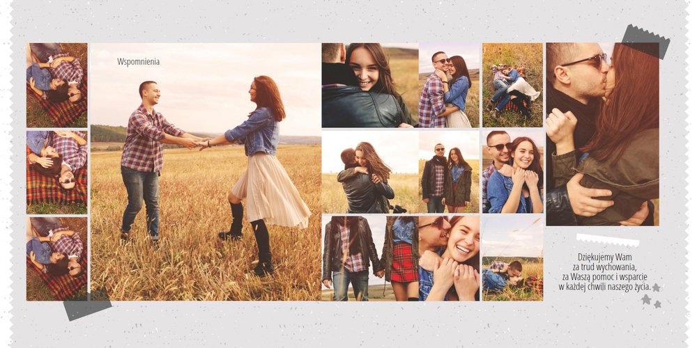 Podziękowanie dla rodziców, to ważny moment na każdym weselu. Wiele par szuka pomysłu na gustowny i niepowtarzalny prezent dla rodziców. Zdjęcia szczęśliwych latorośli będą z pewnością pięknym i ponadczasowym upominkiem. Szablon “Kochanym Rodzicom” idealnie sprawdzi się jako wyraz wdzięczności za miłość i trud wychowania. Książka pozostaje w delikatnych odcieniach bieli i szarości, dodatkowo ozdabiają ją drobne elementy w postaci tasiemek i ramek. Z tym szablonem zaprojektujesz oryginalne podziękowania dla rodziców.