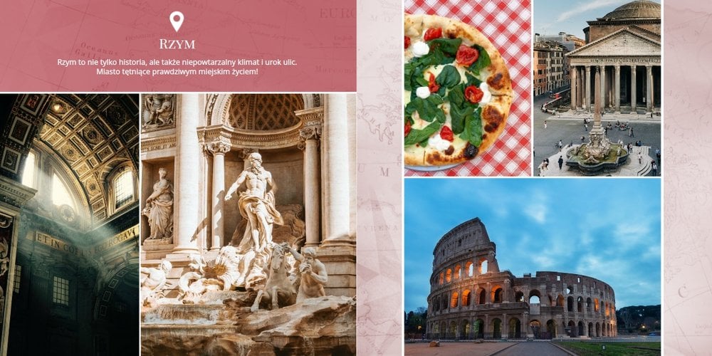 Zielono-czerwona kolorystyka stron, ujęta za pomocą eleganckiego wzornictwa idealnie oddaje klimat włoskich regionów. To w końcu kraj, słynący z wielkich arcydzieł sztuki, wspaniałej kuchni, malowniczych krajobrazów i chwytającej za serce atmosfery. Wszystkie te scenerie zachowaj we wnętrzu swojego projektu z szablonem "Kolekcja podróżnicza - Włochy".