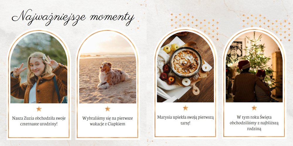 Początek roku to idealny czas na jego podsumowanie, a niezapomniane chwile i wydarzenia, uwiecznione na zdjęciach, warto przechowywać w odpowiedni sposób. Szablon "Kolekcja podsumowania roku" pomoże opowiedzieć Twoją historię w ciekawy i estetyczny sposób.