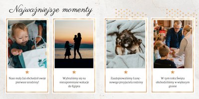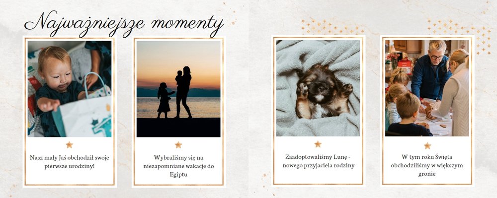 Początek roku to idealny czas na jego podsumowanie, a niezapomniane chwile i wydarzenia, uwiecznione na zdjęciach, warto przechowywać w odpowiedni sposób. Szablon "Kolekcja podsumowania roku" pomoże opowiedzieć Twoją historię w ciekawy i estetyczny sposób.