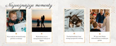 Przeważa w nich jeden motyw kolorystyczny, co roku z innym kolorem przewodnim. Całość dopełniona jest drobnymi, złotymi dodatkami w gwiezdnym motywie oraz białymi ramkami wokół zdjęć. Zbierz wszystkie ulubione zdjęcia z całego roku w jednym fotoalbumie i stwórz z nich kolekcję wspomnień, do których możesz powracać kiedy tylko najdzie Cię ochota.
