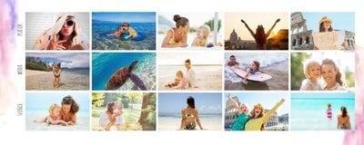 Kolorowe wakacje to barwny szablon z ciekawym motywem akwareli - idealny na Wasze letnie wspomnienia. Szablon jest uniwersalny, dlatego wakacyjny fotoalbum może stać się zbiorem wyjazdowych wspomnień z całego roku, ale również z podróży z konkretnego miejsca np. z polskich gór, z nad morza, Mazur czy egzotycznej zagranicznej wycieczki. Oryginalne układy zdjęć i kontrast białych teł z kolorowymi akwarelami pięknie zaprezentuje się jako wydrukowany fotoalbum.