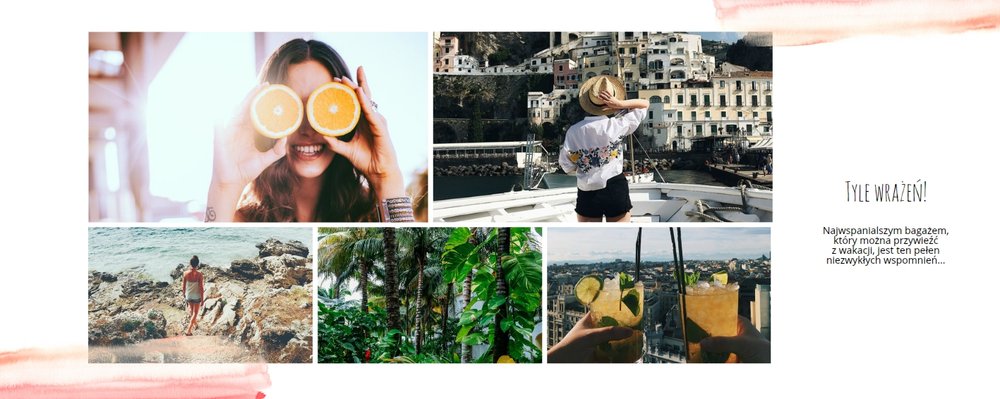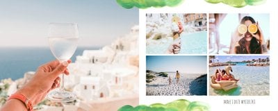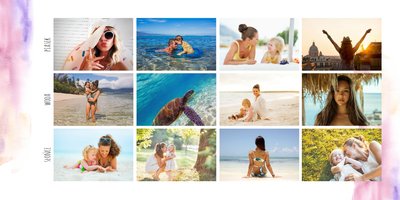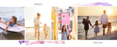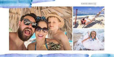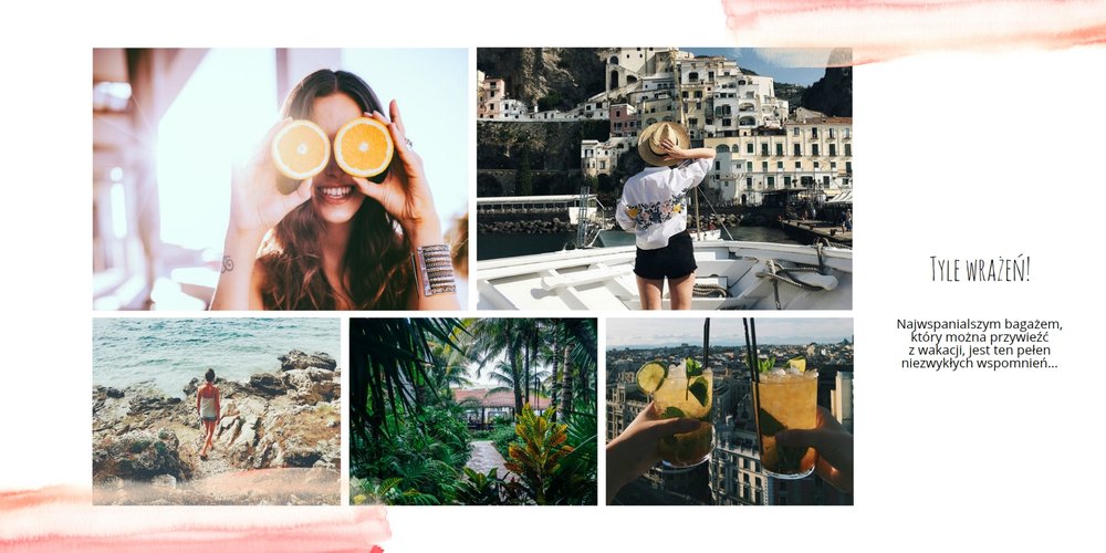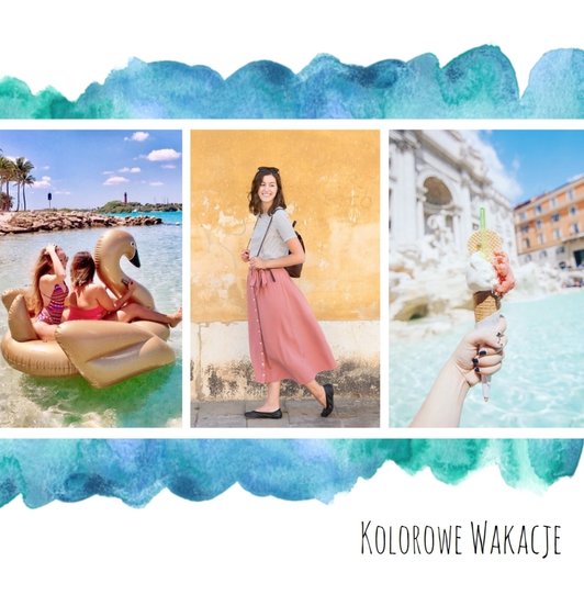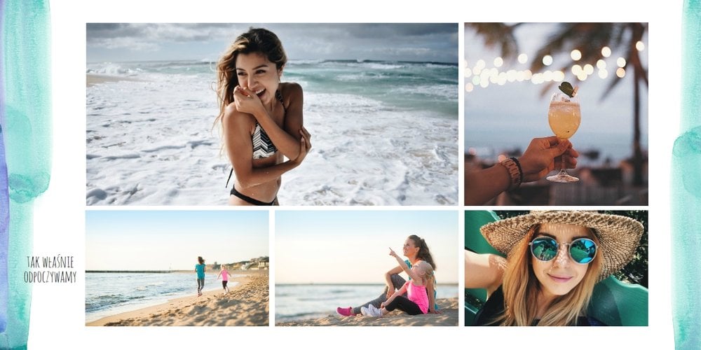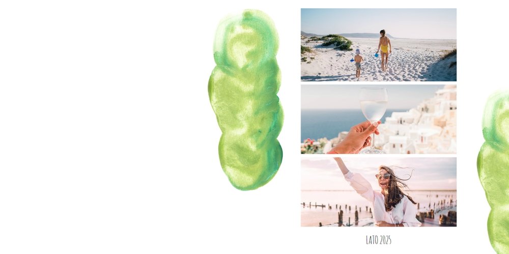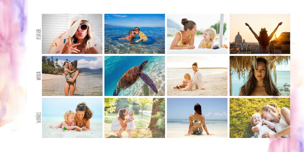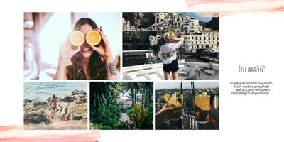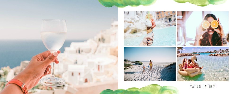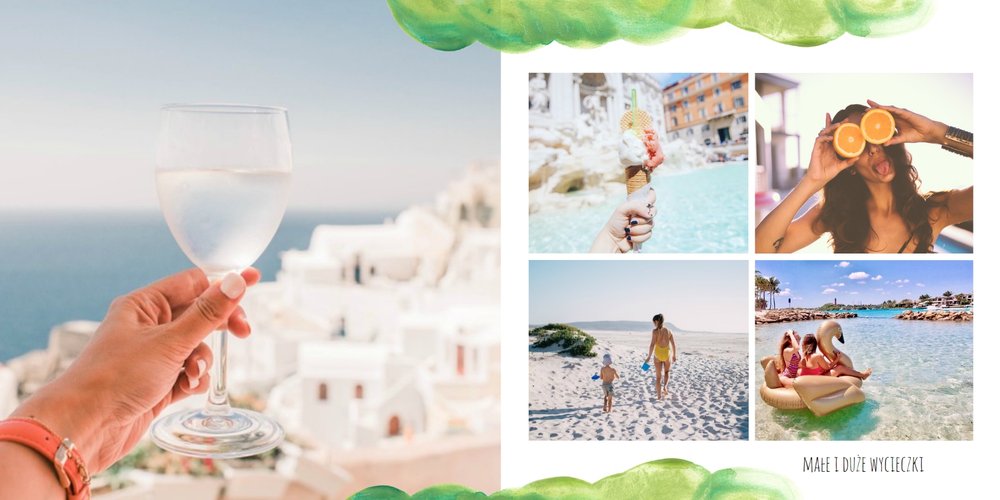Kolorowe wakacje to barwny szablon z ciekawym motywem akwareli - idealny na Wasze letnie wspomnienia. Szablon jest uniwersalny, dlatego wakacyjny fotoalbum może stać się zbiorem wyjazdowych wspomnień z całego roku, ale również z podróży z konkretnego miejsca np. z polskich gór, z nad morza, Mazur czy egzotycznej zagranicznej wycieczki. Oryginalne układy zdjęć i kontrast białych teł z kolorowymi akwarelami pięknie zaprezentuje się jako wydrukowany fotoalbum.