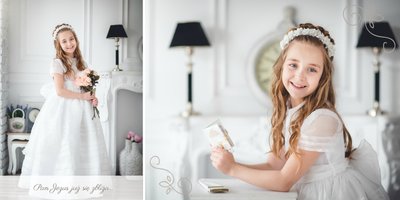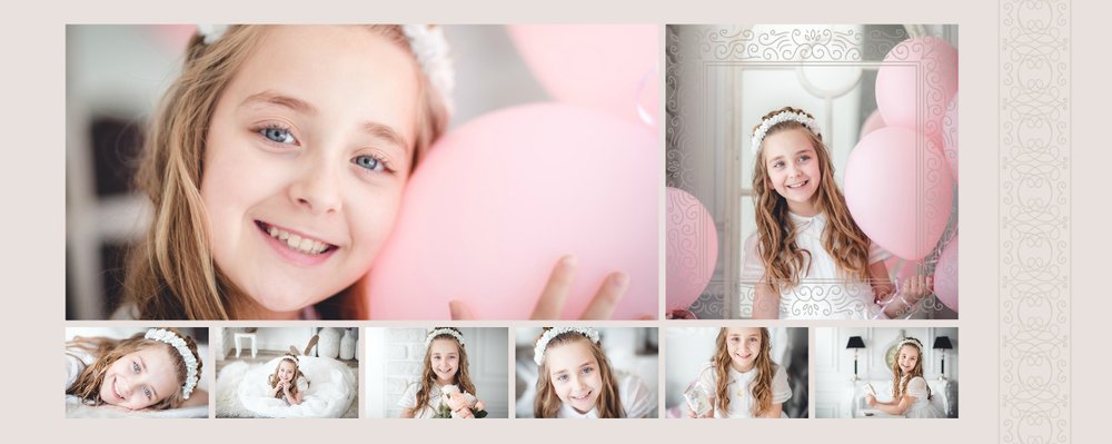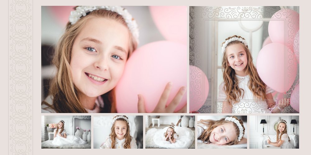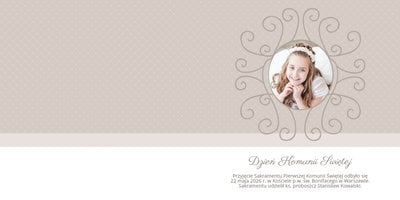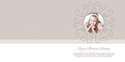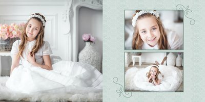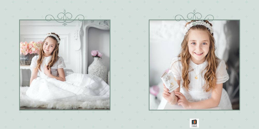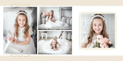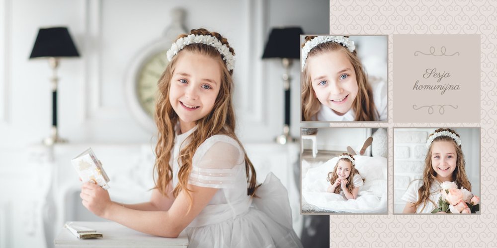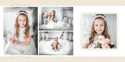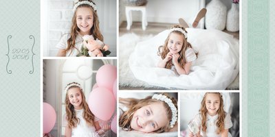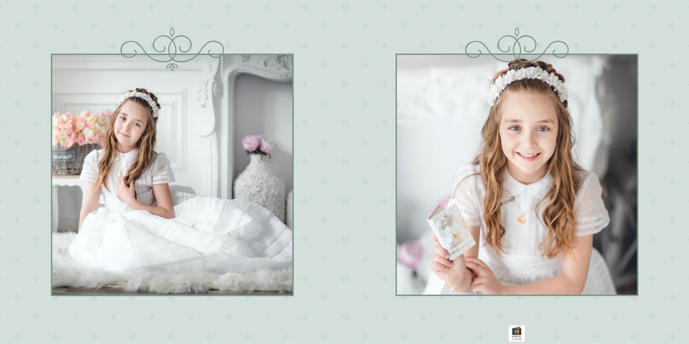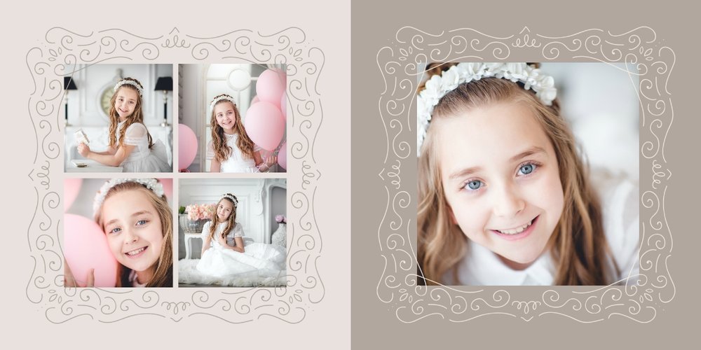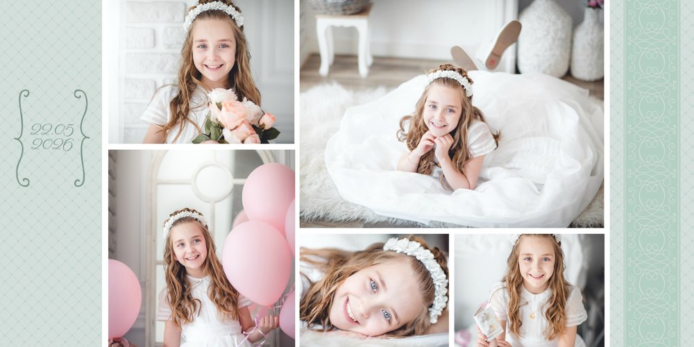 Szablon Dzień Komunii Świętej idealnie sprawdzi się przy projektowaniu fotoksiążki dziecka upamiętniającej przyjęcie Sakramentu Pierwszej Komunii Świętej. Dzięki niemu stworzysz dla dziecka komunijną pamiątkę na całe życie z jednego z najważniejszych wydarzeń w jego życiu. Strony utrzymane są w kolorach kremu, beżu i delikatnego turkusu, a elegancji dodają im piękne ornamenty, ramki i monogramy. Szablon idealny jako prezent dla Rodziców Chrzestnych oraz pamiątka Komunii. Szablon Dzień Komunii Świętej tworzy serię razem z szablonami Dzień Chrztu Świętego oraz Dzień Ślubu.