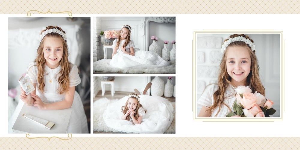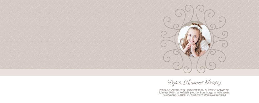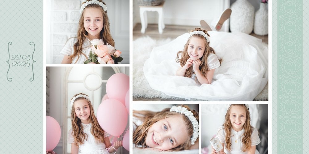 Szablon Dzień Komunii Świętej idealnie sprawdzi się przy projektowaniu fotoksiążki dziecka upamiętniającej przyjęcie Sakramentu Pierwszej Komunii Świętej. Dzięki niemu stworzysz dla dziecka komunijną pamiątkę na całe życie z jednego z najważniejszych wydarzeń w jego życiu. Strony utrzymane są w kolorach kremu, beżu i delikatnego turkusu, a elegancji dodają im piękne ornamenty, ramki i monogramy. Szablon idealny jako prezent dla Rodziców Chrzestnych oraz pamiątka Komunii. Szablon Dzień Komunii Świętej tworzy serię razem z szablonami Dzień Chrztu Świętego oraz Dzień Ślubu.
