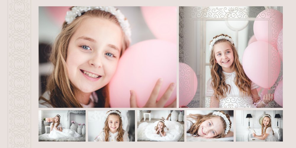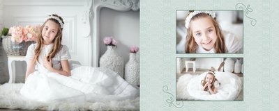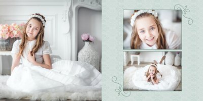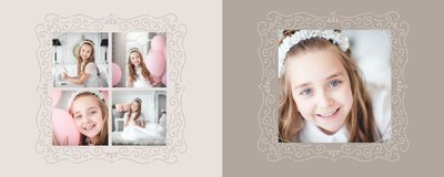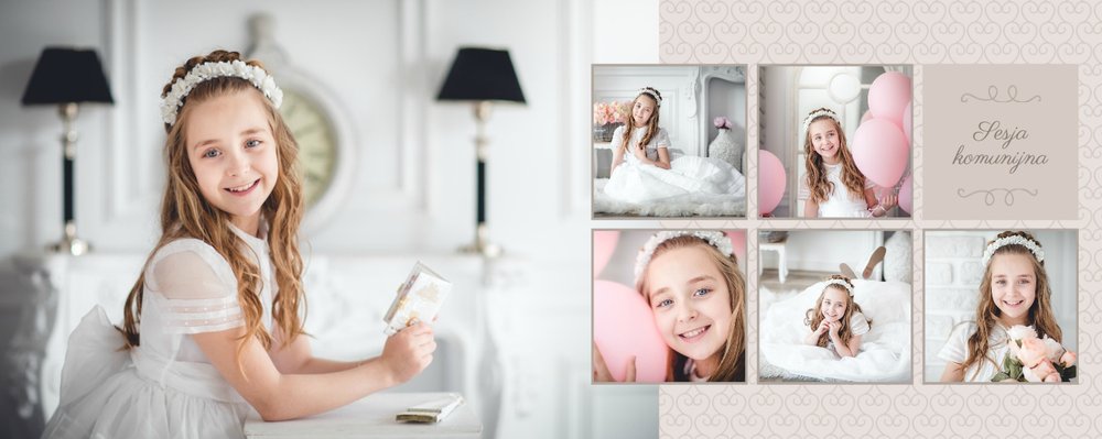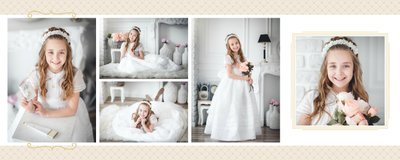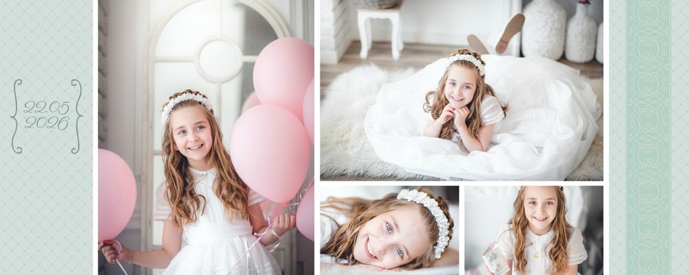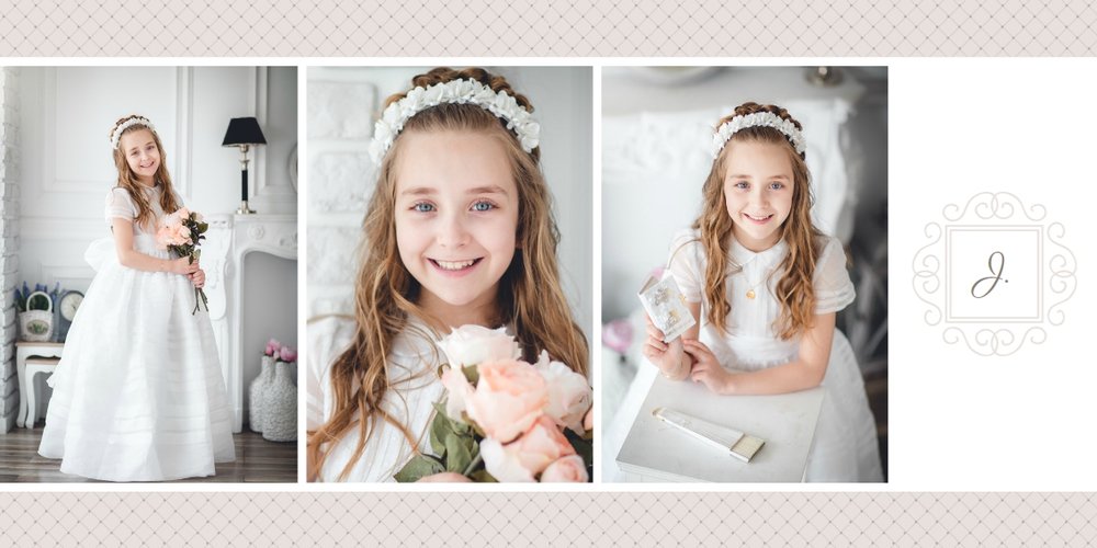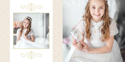 Szablon Dzień Komunii Świętej idealnie sprawdzi się przy projektowaniu fotoksiążki dziecka upamiętniającej przyjęcie Sakramentu Pierwszej Komunii Świętej. Dzięki niemu stworzysz dla dziecka komunijną pamiątkę na całe życie z jednego z najważniejszych wydarzeń w jego życiu. Strony utrzymane są w kolorach kremu, beżu i delikatnego turkusu, a elegancji dodają im piękne ornamenty, ramki i monogramy. Szablon idealny jako prezent dla Rodziców Chrzestnych oraz pamiątka Komunii. Szablon Dzień Komunii Świętej tworzy serię razem z szablonami Dzień Chrztu Świętego oraz Dzień Ślubu.