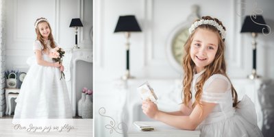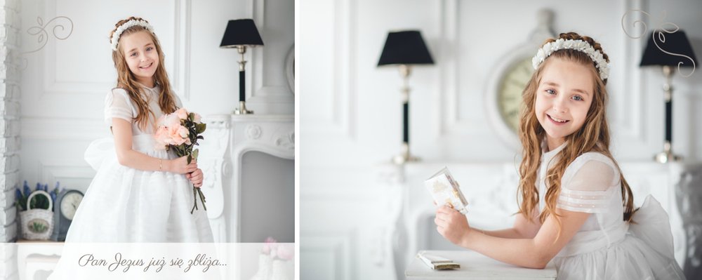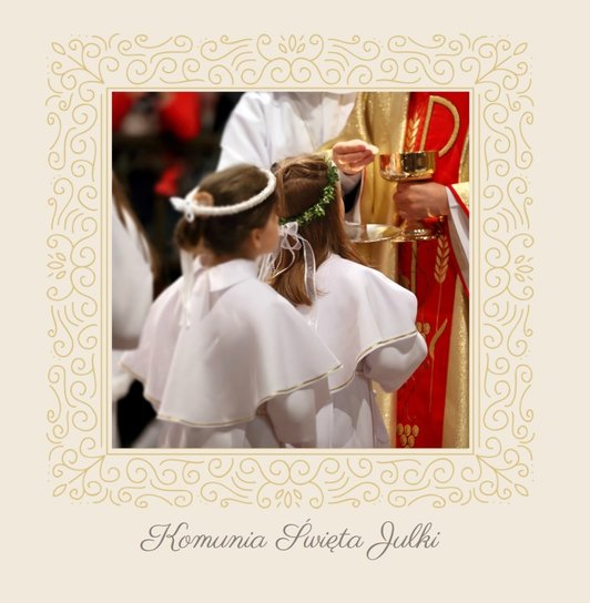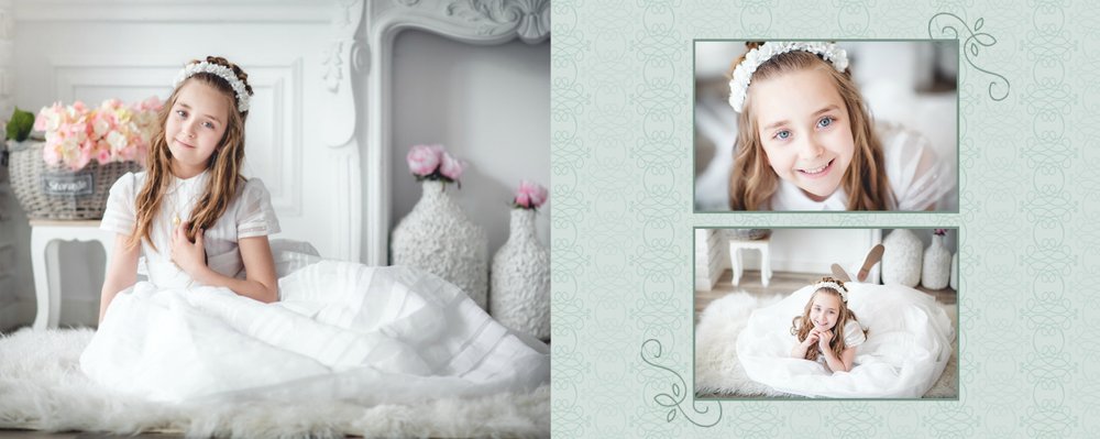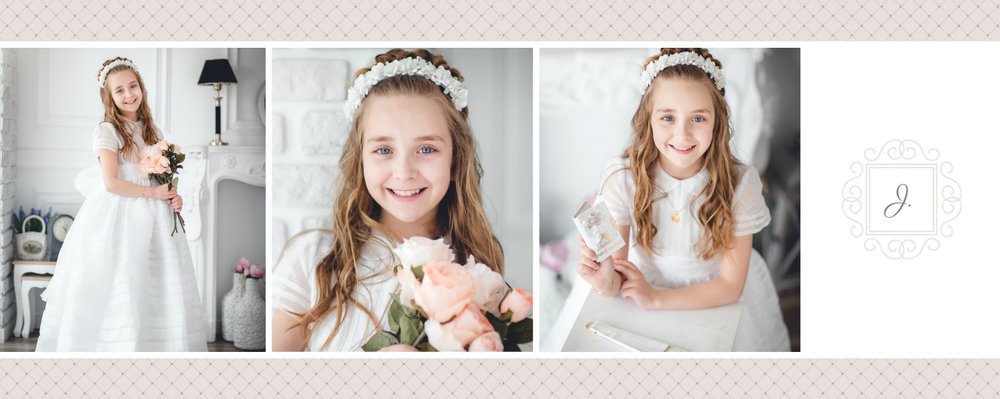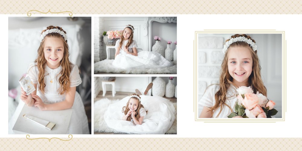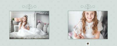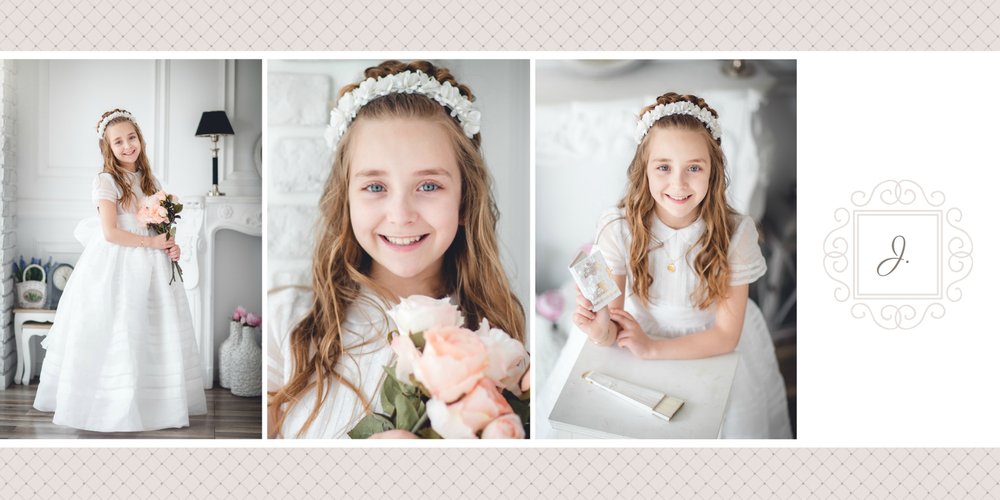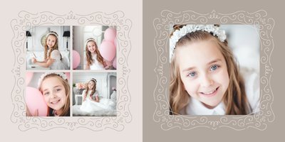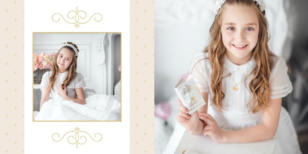 Szablon Dzień Komunii Świętej idealnie sprawdzi się przy projektowaniu fotoksiążki dziecka upamiętniającej przyjęcie Sakramentu Pierwszej Komunii Świętej. Dzięki niemu stworzysz dla dziecka komunijną pamiątkę na całe życie z jednego z najważniejszych wydarzeń w jego życiu. Strony utrzymane są w kolorach kremu, beżu i delikatnego turkusu, a elegancji dodają im piękne ornamenty, ramki i monogramy. Szablon idealny jako prezent dla Rodziców Chrzestnych oraz pamiątka Komunii. Szablon Dzień Komunii Świętej tworzy serię razem z szablonami Dzień Chrztu Świętego oraz Dzień Ślubu.