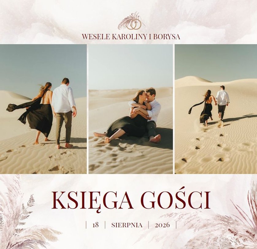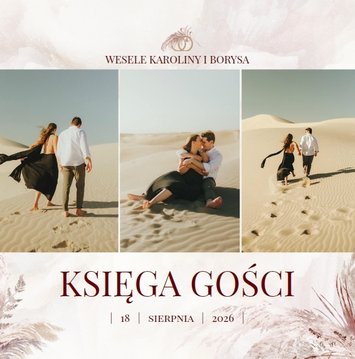 "Księga Gości z ankietami (fotobudka)" została zaprojektowana w duchu stylu boho - naturalnych, lekkich elementów ozdobnych i delikatnych, teksturowanych teł. Całość została zachowana w kremowej kolorystyce, przełamanej brudnym różem i odcieniami bordo. Nie brakuje również metalicznych tonów w postaci złoconych dodatków.