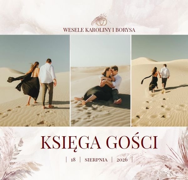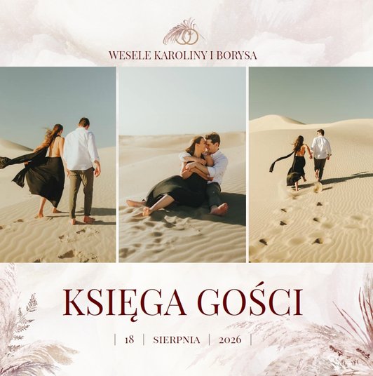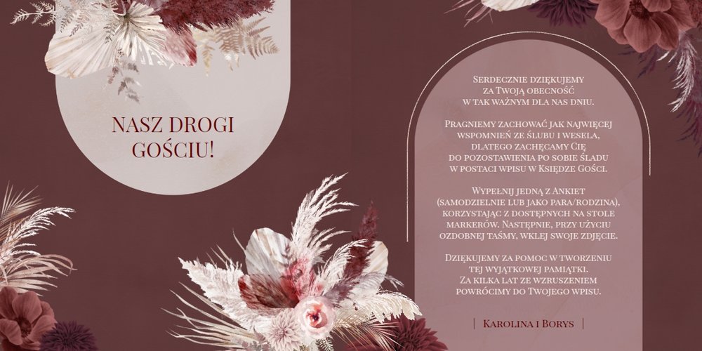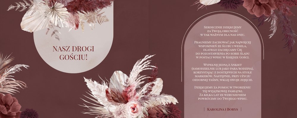 "Księga Gości z ankietami (fotobudka)" została zaprojektowana w duchu stylu boho - naturalnych, lekkich elementów ozdobnych i delikatnych, teksturowanych teł. Całość została zachowana w kremowej kolorystyce, przełamanej brudnym różem i odcieniami bordo. Nie brakuje również metalicznych tonów w postaci złoconych dodatków.
