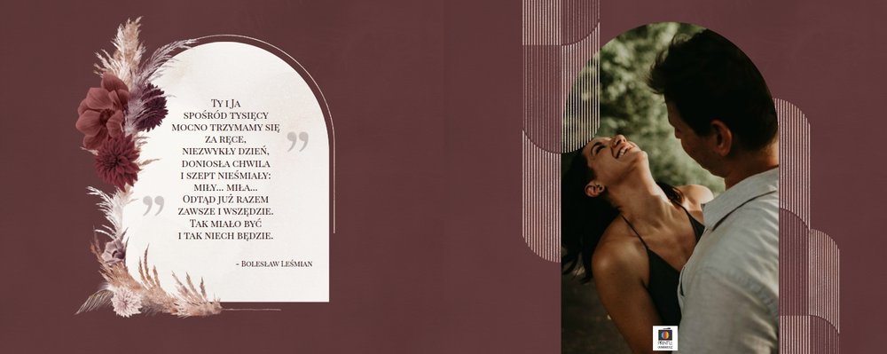 - miejsce z cytatem na ostatniej stronie projektu. Możesz zachować tam dowolny tekst - ulubioną sentencję, fragment piosenki, który jest dla Was ważny (przykładowo, korzystając z utworu wybranego na pierwszy taniec) lub motto, którym Ty i Twój partner się kierujecie;