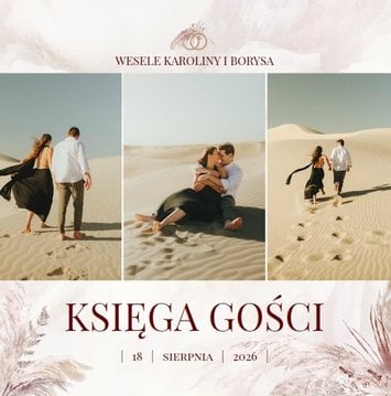 "Księga Gości z ankietami (standard)" została zaprojektowana w duchu stylu boho - naturalnych, lekkich elementów ozdobnych i delikatnych, teksturowanych teł. Całość została zachowana w kremowej kolorystyce, przełamanej brudnym różem i odcieniami bordo. Nie brakuje również metalicznych tonów w postaci złoconych dodatków.