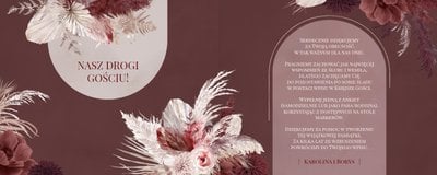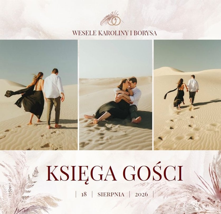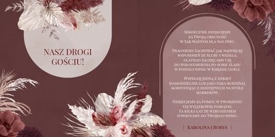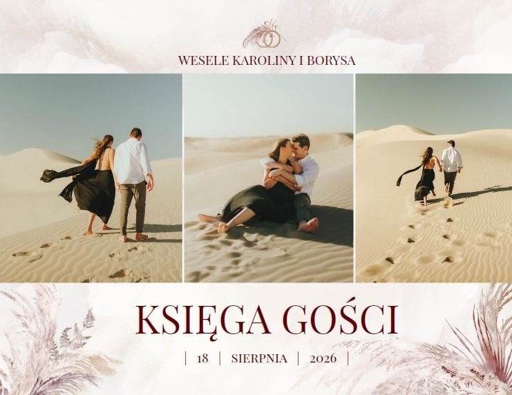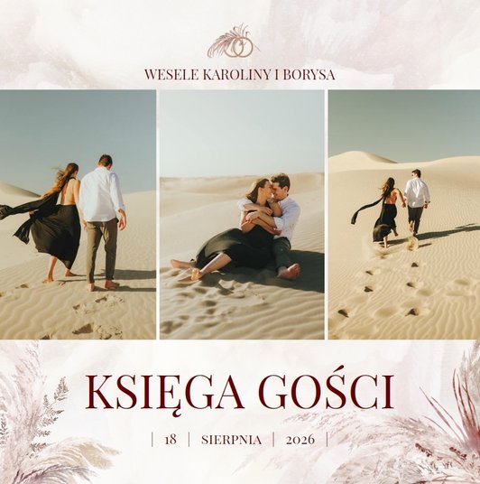 "Księga Gości z ankietami (standard)" została zaprojektowana w duchu stylu boho - naturalnych, lekkich elementów ozdobnych i delikatnych, teksturowanych teł. Całość została zachowana w kremowej kolorystyce, przełamanej brudnym różem i odcieniami bordo. Nie brakuje również metalicznych tonów w postaci złoconych dodatków.