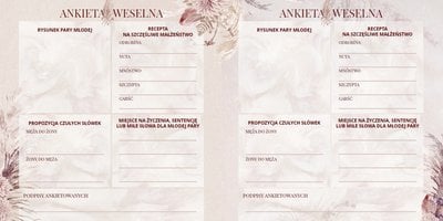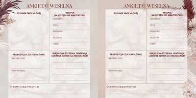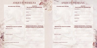 - 36 weselnych ankiet, zawierających krótkie pytania z miejscem na odpowiedzi oraz pole na rysunek Pary Młodej;