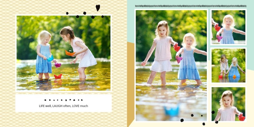 Miało być wesoło i rodzinnie, w tym szablonie postawiliśmy więc na ciepłe, pastelowe barwy, które przełamaliśmy ramkami i czcionkami w kolorze czarnym. Zaprojektowane przez nas strony są uniwersalne, aby można je było zmodyfikować pod swoje potrzeby i stworzyć jedyną w swoim rodzaju fotoopowieść lub fotoksiążkę na prezent.