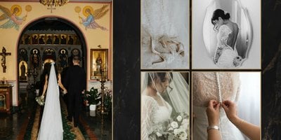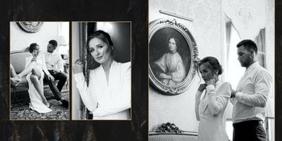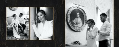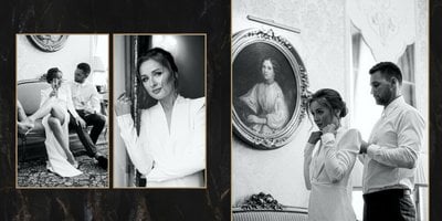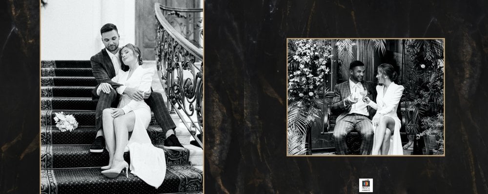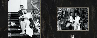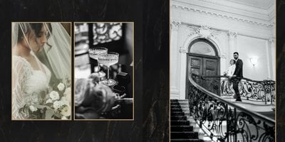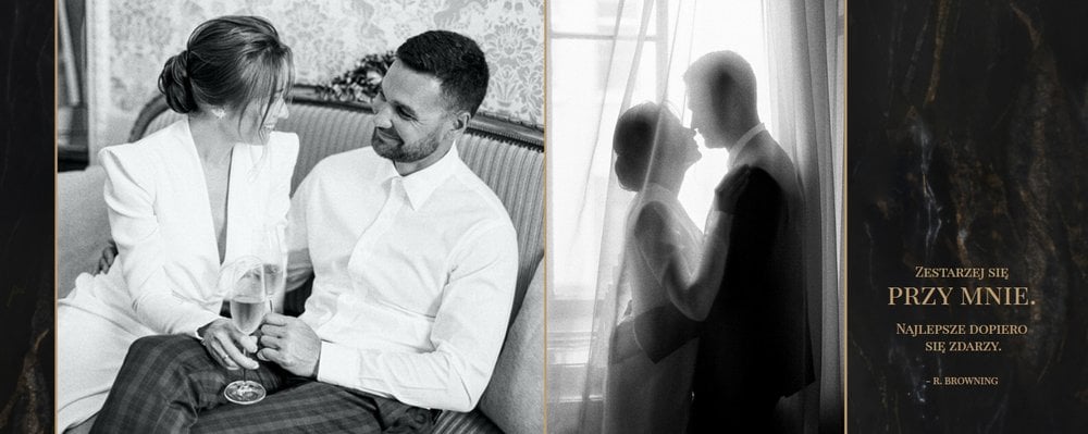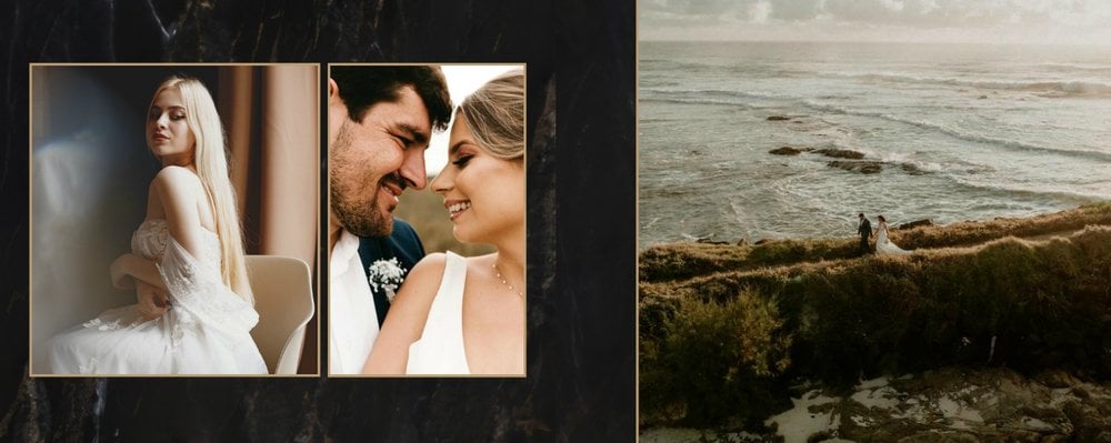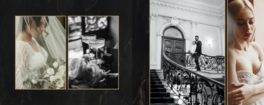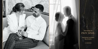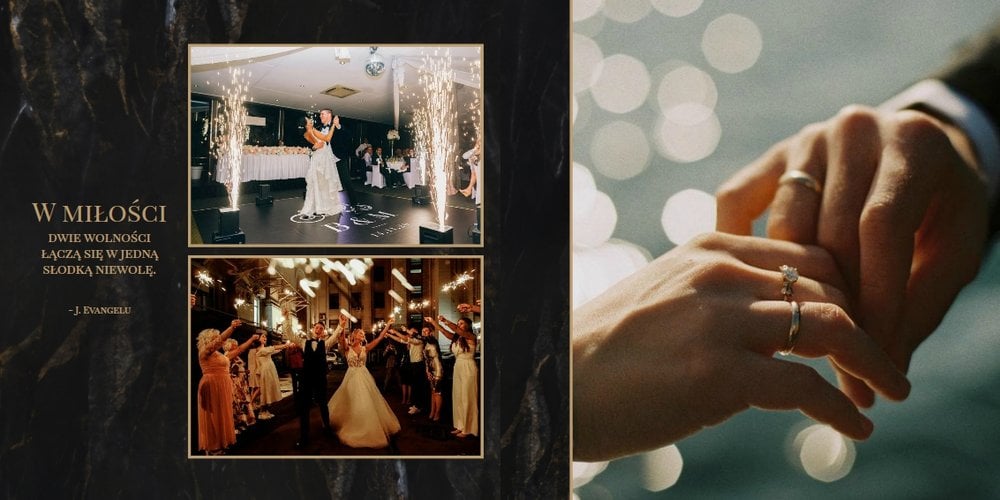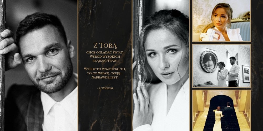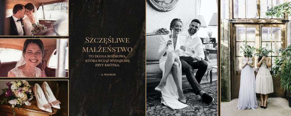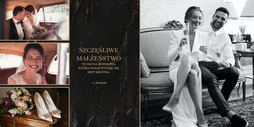 Szablon "Marmurowy album ślubny" to idealna propozycja dla osób ceniących elegancję z minimalizmem. Wypełniony ciemnymi, marmurowymi tłami oraz złotem na akcentach, podkreśli szyk każdej ślubnej fotografii. W szablonie główne skrzypce grają nowoczesne układy zdjęć oraz czułe teksty, które można dowolnie personalizować.