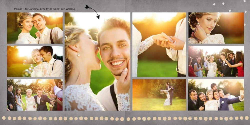 Fotoksiążka ślubna nie musi być nudna. Mąż i żona, to szablon, który został stworzony dla wszystkich Młodych Par podchodzących do ślubu w sposób oryginalny i luźny. Stonowane kolory szarości i beżu oraz modna grafika sprawią, że pamiątka ze ślubu stanie się wyjątkowa. Fotoksiążka z tym szablonem, to również idealny pomysł na prezent dla gości weselnych.