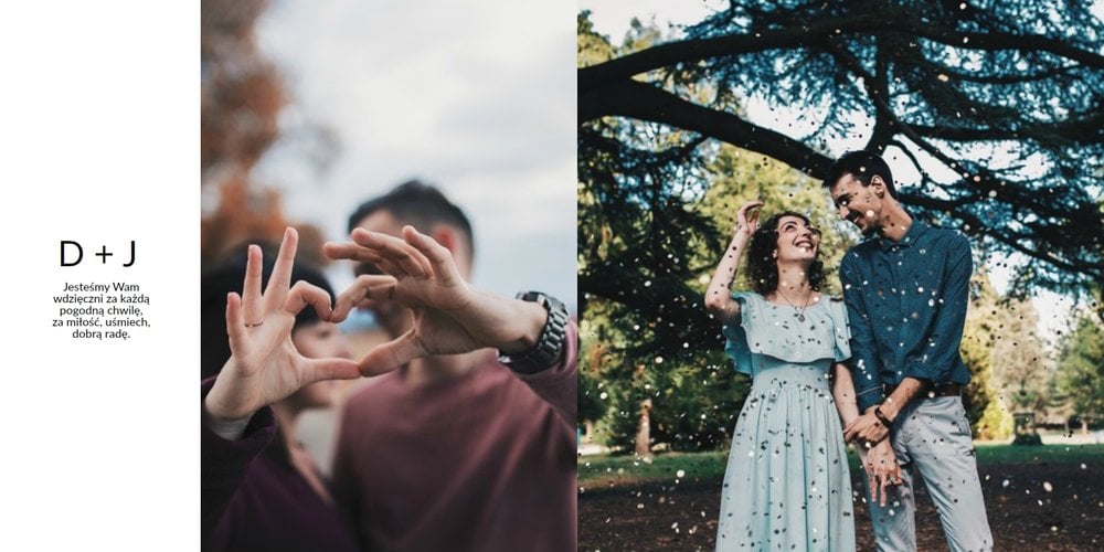 Minimalistyczna forma, proste układy zdjęć i wzruszające teksty wyrażające wdzięczność, połączone z Waszymi wspólnymi zdjęciami, pozwolą stworzyć niezwykły fotoalbum, który stanie się pamiątką na wiele, wiele lat.