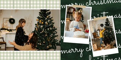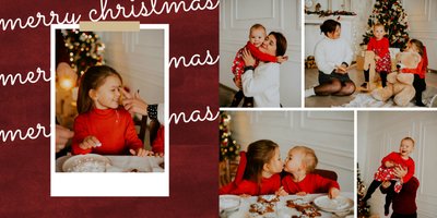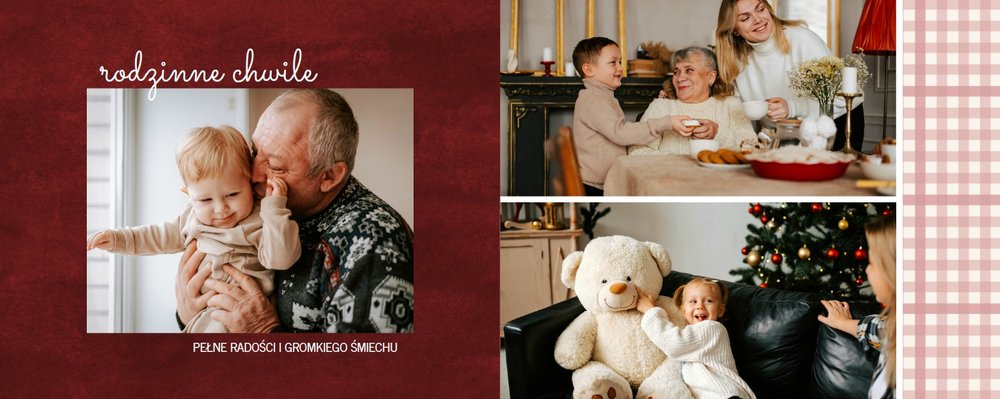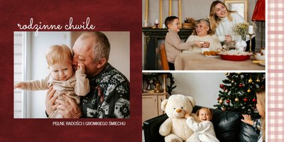 Fotoalbum z szablonem "Minimalistyczny prezent na Święta" to idealna propozycja na tegoroczny prezent pod choinkę. Klasyczna kolorystyka - głęboka czerwień i butelkowa zieleń - podkreślą świąteczny charakter rodzinnych zdjęć. Minimalistyczne tła w postaci obrusowej kratki i weluru dodadzą całości elegancki wygląd, a polaroidowe dodatki wniosą delikatną nutę retro. Uzupełnij szablon fotoalbumu "Minimalistyczny prezent na Święta" rodzinnymi fotografiami - zarówno z sesji świątecznej, jak i codziennych chwil.