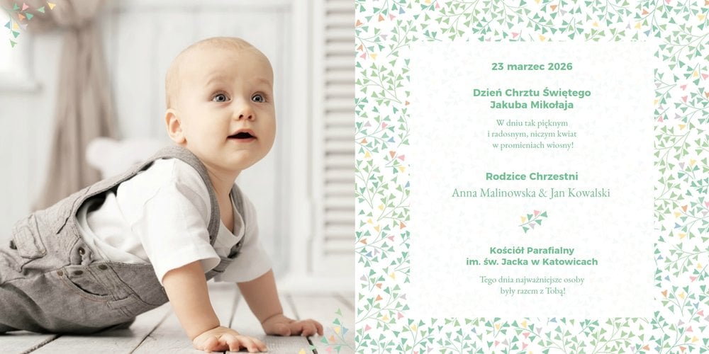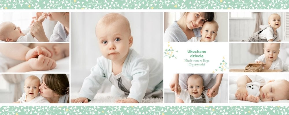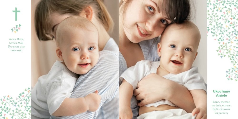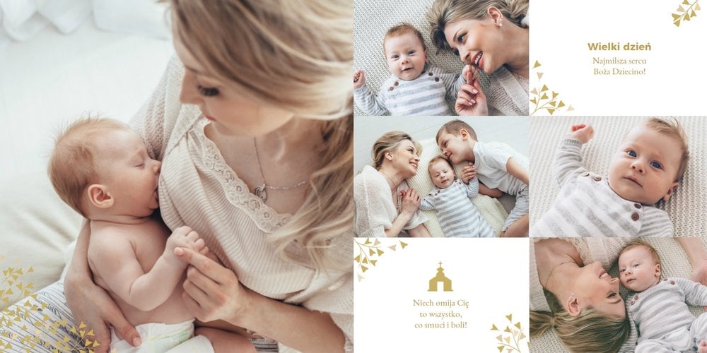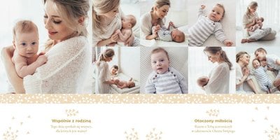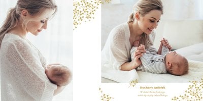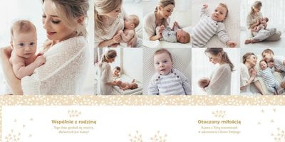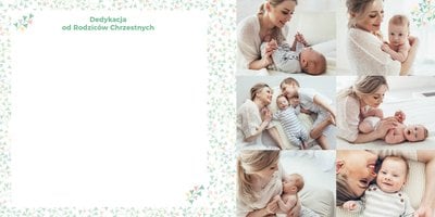 Z szablonem "Mój pierwszy sakrament" przygotujesz piękną pamiątkę z Chrztu Świętego Twojego dziecka lub stworzysz oryginalny prezent dla Chrześniaka. Przejrzyj foldery i przygotuj zdjęcia, z którymi zaprojektujesz wyjątkowy fotoalbum. Z całą pewnością będzie on pamiątką na wiele, wiele lat. Wnętrze szablonu zapewnia miejsca na piękne zdjęcia z sakramentu przyjęcia chrztu oraz wzruszające cytaty. Wszystko to sprawi, że fotoalbum będzie wzruszać obdarowanych. Szablon "Mój pierwszy sakrament" to minimalistyczny szablon, w którym znajdziesz delikatne elementy graficzne oraz mnóstwo miejsca na fotografie z tego wielkiego dnia.