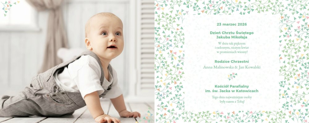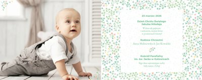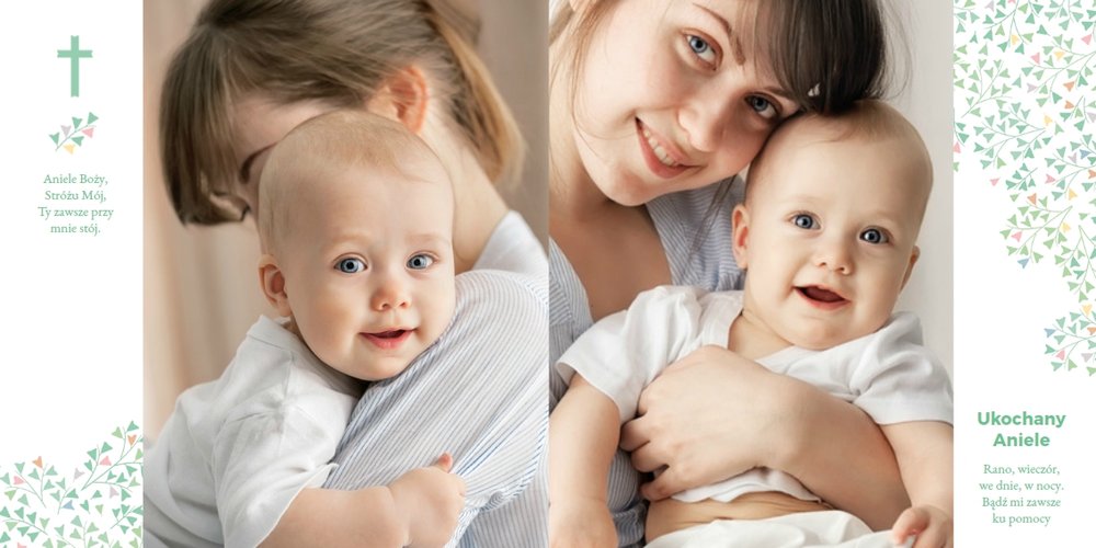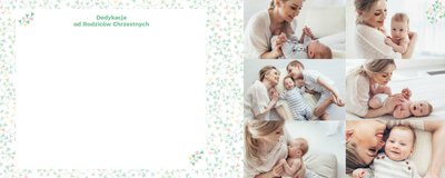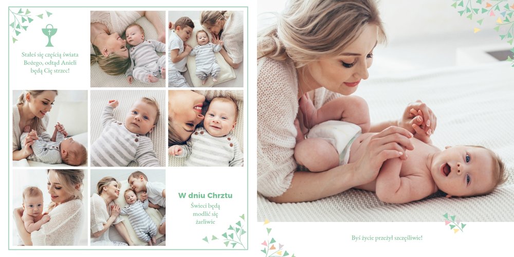 Z szablonem "Mój pierwszy sakrament" przygotujesz piękną pamiątkę z Chrztu Świętego Twojego dziecka lub stworzysz oryginalny prezent dla Chrześniaka. Przejrzyj foldery i przygotuj zdjęcia, z którymi zaprojektujesz wyjątkowy fotoalbum. Z całą pewnością będzie on pamiątką na wiele, wiele lat. Wnętrze szablonu zapewnia miejsca na piękne zdjęcia z sakramentu przyjęcia chrztu oraz wzruszające cytaty. Wszystko to sprawi, że fotoalbum będzie wzruszać obdarowanych. Szablon "Mój pierwszy sakrament" to minimalistyczny szablon, w którym znajdziesz delikatne elementy graficzne oraz mnóstwo miejsca na fotografie z tego wielkiego dnia.