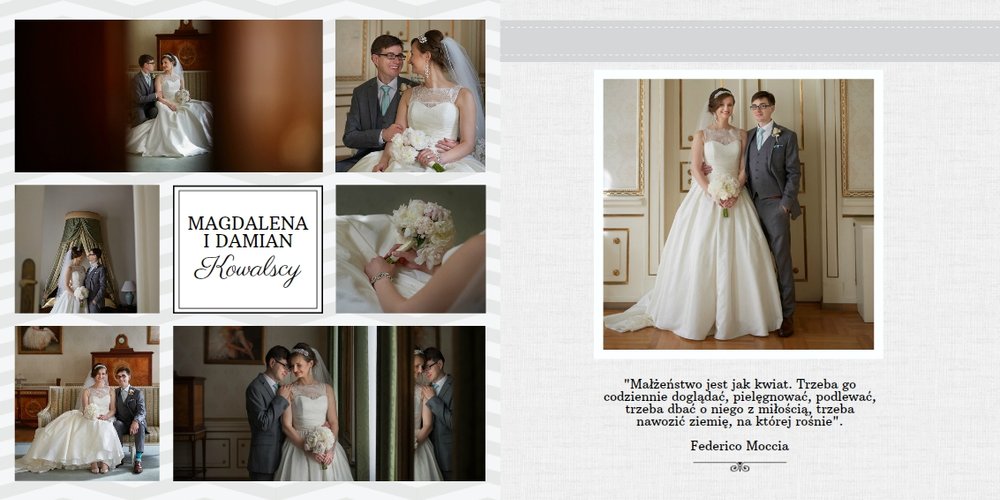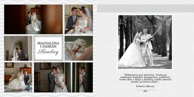Szablon klasyczny sprawdzi się idealnie w przypadku Młodych Par lubiących elegancję. Jasne barwy i delikatna, ślubna ornamentyka pozwolą wyeksponować piękne kadry i emocje towarzyszące uroczystości. Szablon sprawdzi się idealnie zarówno dla zdjęć kolorowych, w sepii, jak i czarno - białych. Idealny dla Młodych Par oraz jako podziękowanie dla Rodziców.